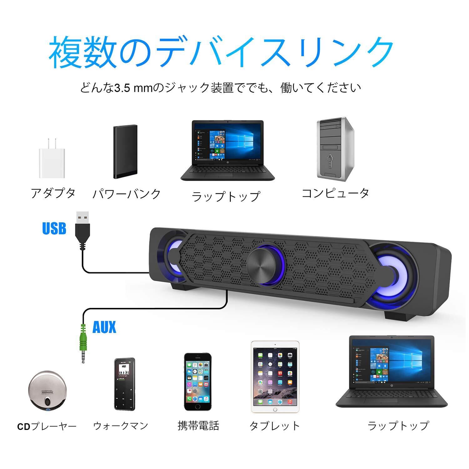 『簡単な操作』:USBケーブルを電源に接続し、3.5mmオーディオケーブルをデバイス(PC /ノートブック/スマートフォンなど)のオーディオ出力に挿入します。次に、スイッチを回してサウンドバーをオンにします。回転ボタンを回して音量を調節します。サウンドバースピーカーの音量を簡単にコントロールできます。