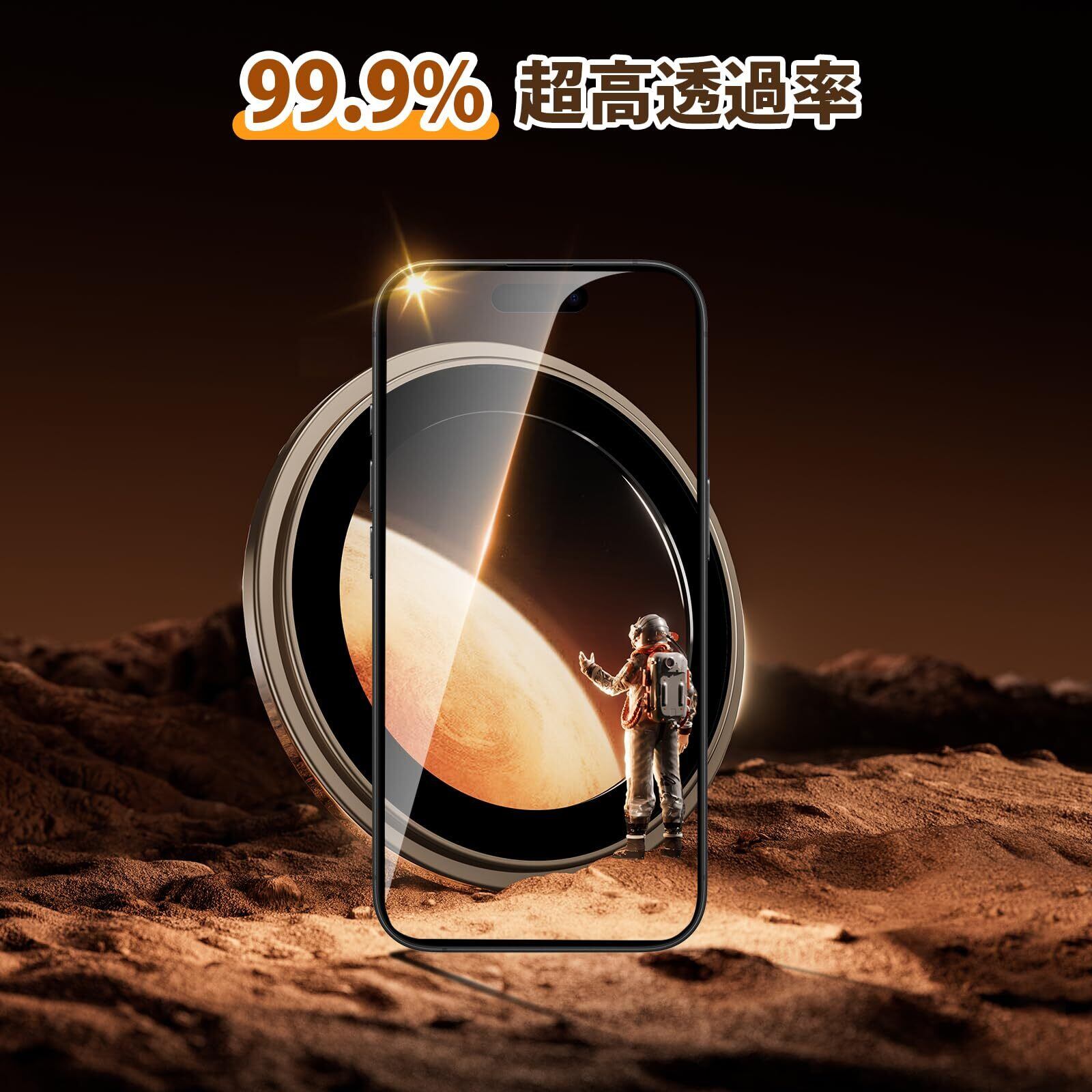【高透過率】iPhone 16 保護フィルムは0.3mm超薄型で、99.9%透過率に達します。貼り付けても、スマホフィルム自体が目立ちにくく、画面の美しさを保ちます。万が一割れても、破片が飛散したり指に刺さることのないよう、特殊なフィルムで飛散防止処理が施されています。