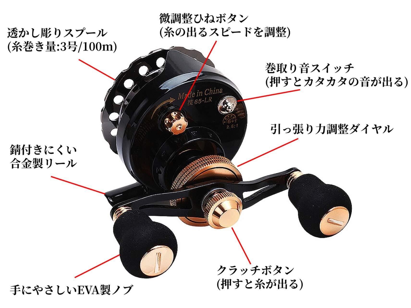 【サイズ】直径約6.5cm、台座長さ約6.2cm 重量:約180g 材質:スチール、アルミ合金、EVA 糸巻量:3号100m ギア比:2.6:1 ベアリング数:6+1BB 仕様:右ハンドル カラー:ブラック