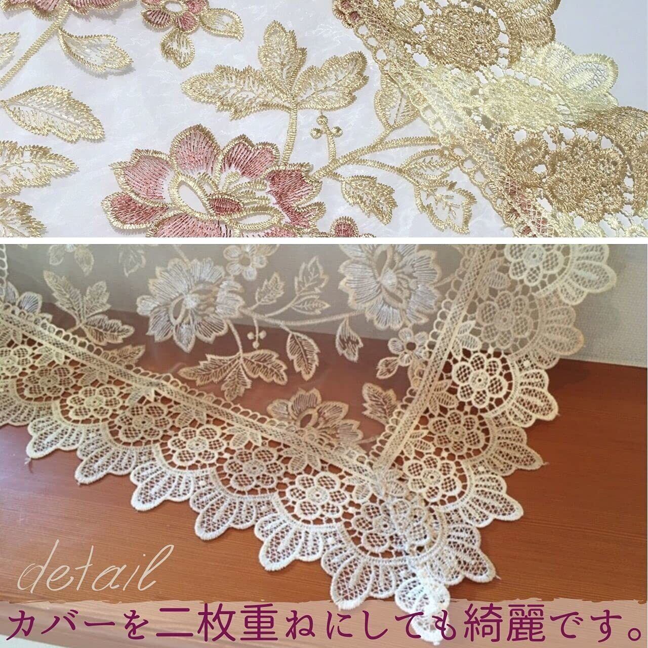 北欧風の光沢があり美しく上品なレースのテーブルクロスです。 淡いピンクと光沢のあるベージュでお部屋に1枚あるだけで華やぎ気分が上がります。おうち時間をリッチに気持ちよく過ごしたい方にいかがでしょう。 テーブルクロスやサイドテーブルに、正方形ですので丸テーブルにも合います。小物や家具 家電テレビ等のマルチカバーや敷物としても綺麗でお楽しみいただけます。 素材はポリエステルです。撥水にはなっておりません。日常的に食卓でご使用の時はビニールシートを被せると良いでしょう。 お手入れ方法 水洗いできます。洗濯機 乾燥機使用可能です。洗濯機では洗濯ネットをご使用ください。シワになり難いですが、洗濯後は早めに形を整えて陰干しが良いでしょう。 サイズ 60×60㎝ 110×110㎝ レースのカットにより2㎝程の誤差が生じることがございまます。