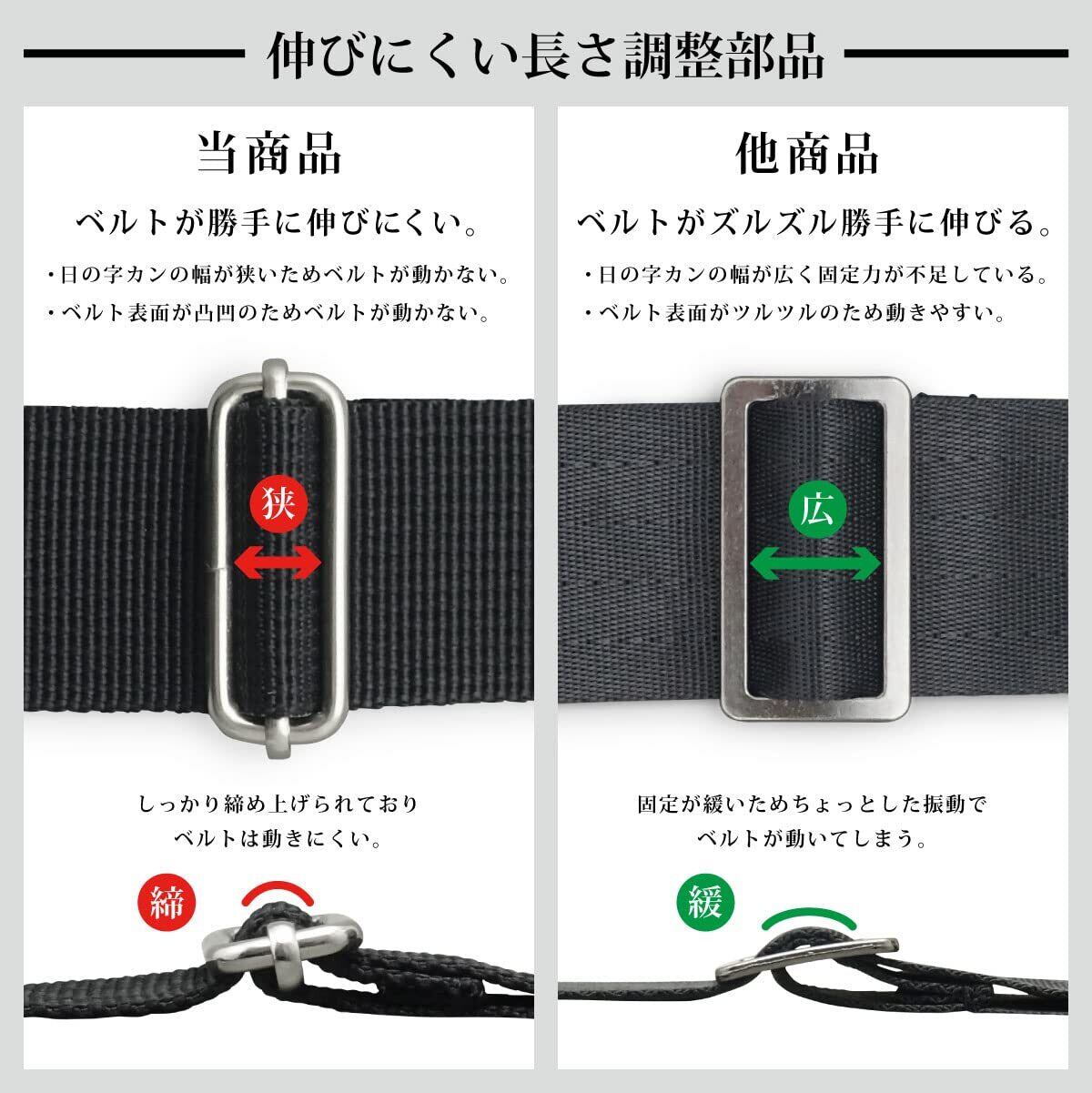 ステンレス製フックを使用した丈夫なショルダーベルトです。※静荷重にてショルダーベルト全体の引張試験を実施。※あらゆる環境下で使用荷重を保証するものではありません。【2021/11/5更新】◆2021年9月~10月頃に発生した一部個体の縫製不良は解消しています。 在庫の全数検品および量産時の検品項目追加により縫製に問題が無いことを確認しています。