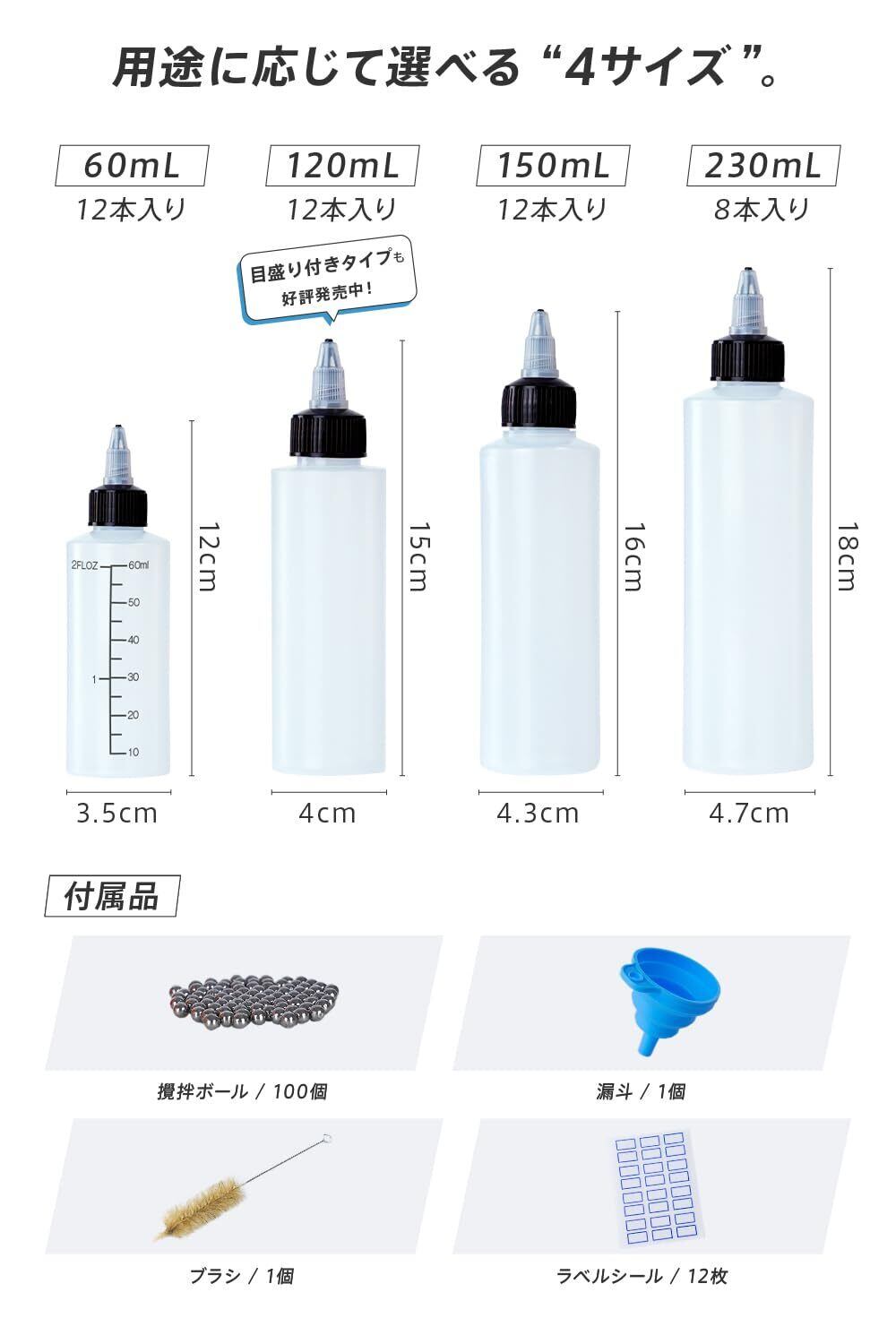 【商品仕様】ドロッパーボトル本体、撹拌ボール100個、漏斗、ボトル、ラベルシール