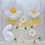 【セット内容】①フェルト布ガーランド×2 ②デイジーバルーン ×4 ③数字バルーン×1 ④三角帽子×1 ⑤リボンひも (10m)