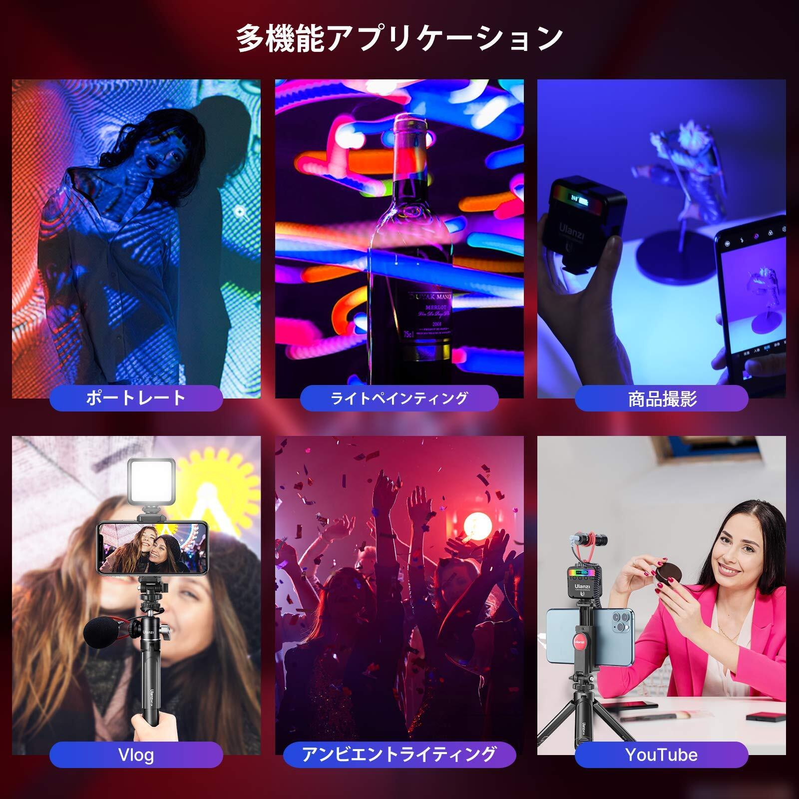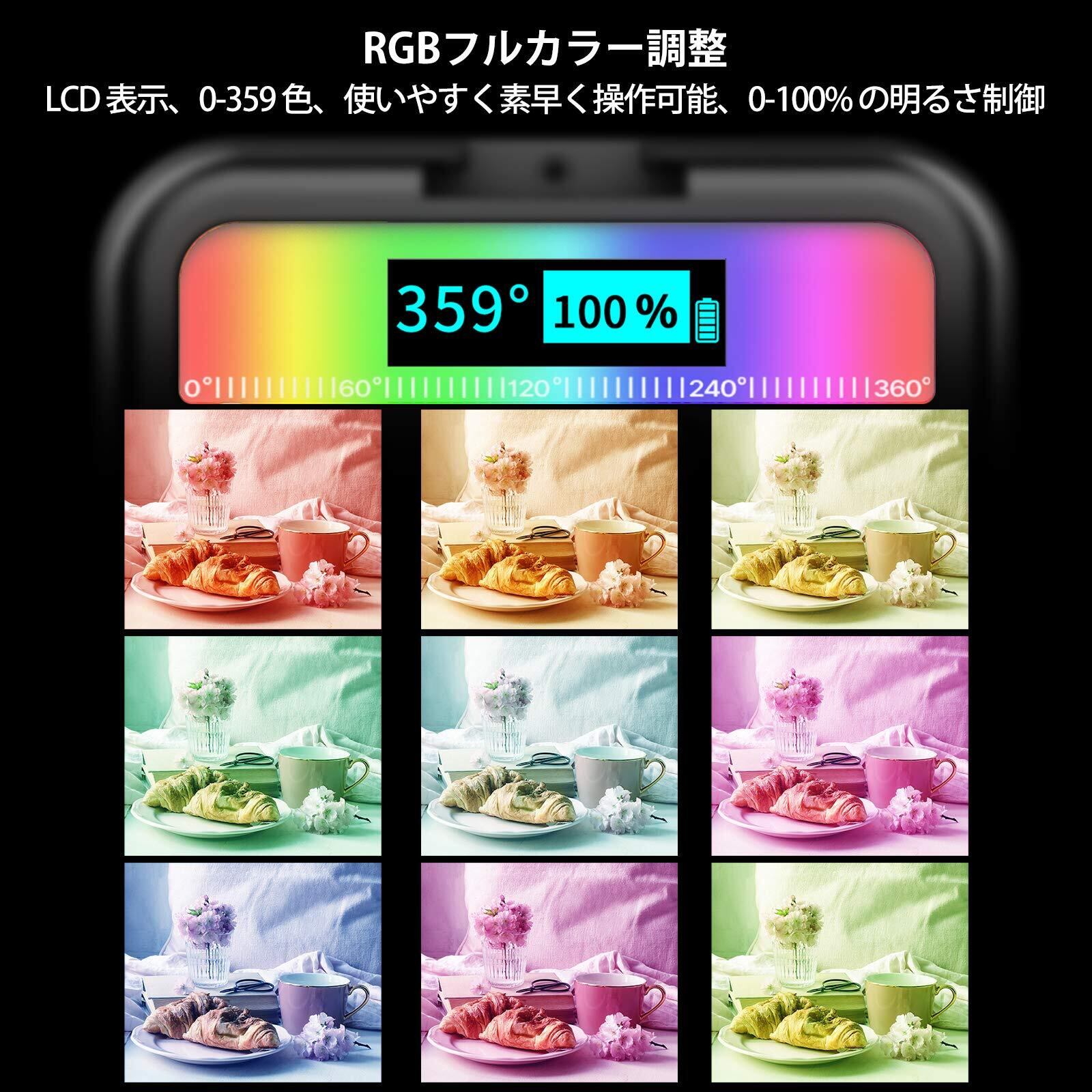 【適用場所】クリエイティブな映像作品の補助光に使えます。例えばモデル撮影、静物撮影、明るい個人写真、tiktok、ユニークな動画。LCDディスプレイは、0-359色を素早く選択することができ、0-100%で明るさをコントロールすることができます。