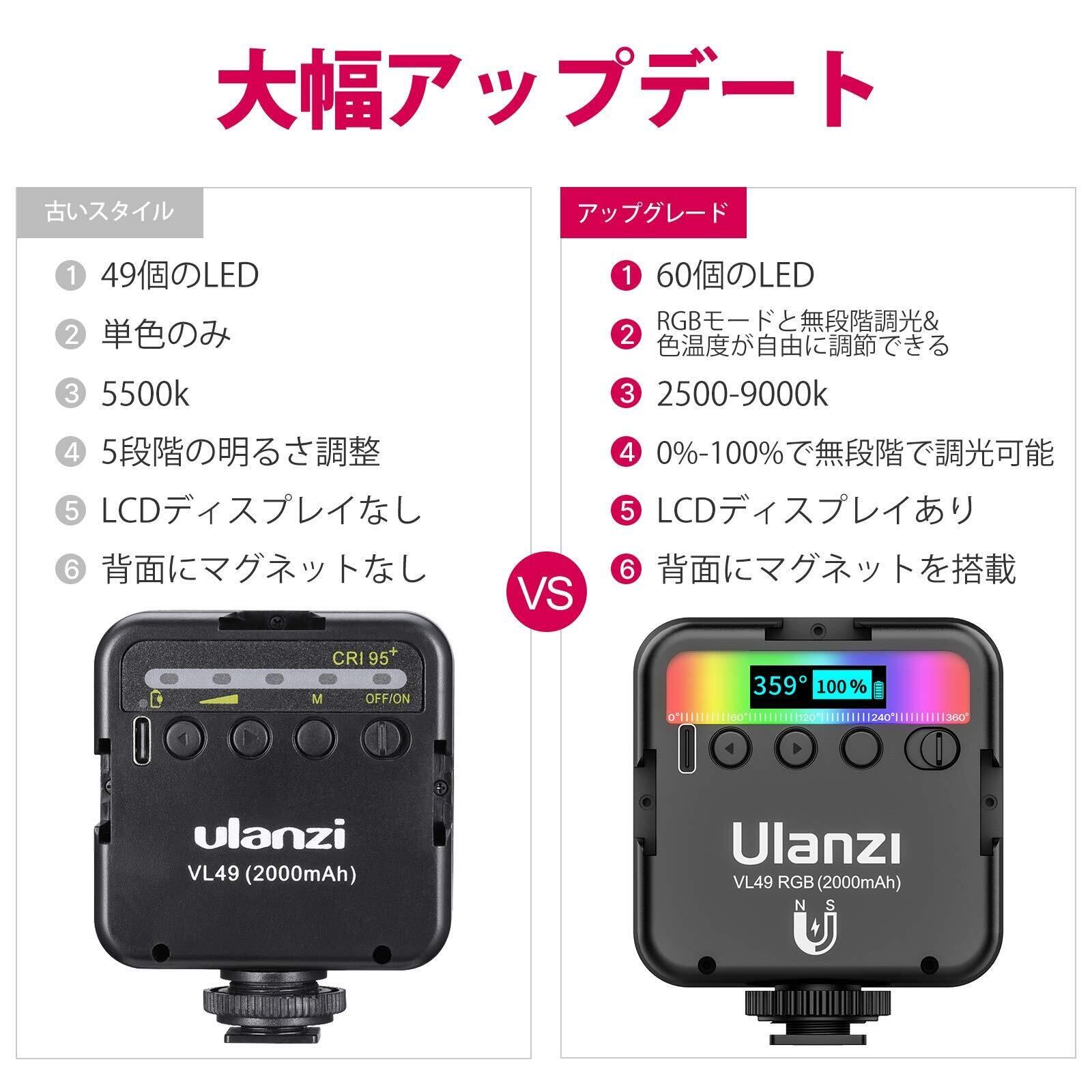 【改良版】VL49のアップデート版、背面にマグネットを搭載し、あらゆる場面で使用することができます。コールドシューを三つ搭載しているので、ニーズに合わせて、マイクやビデオライト等を同時に取り付けることができます。