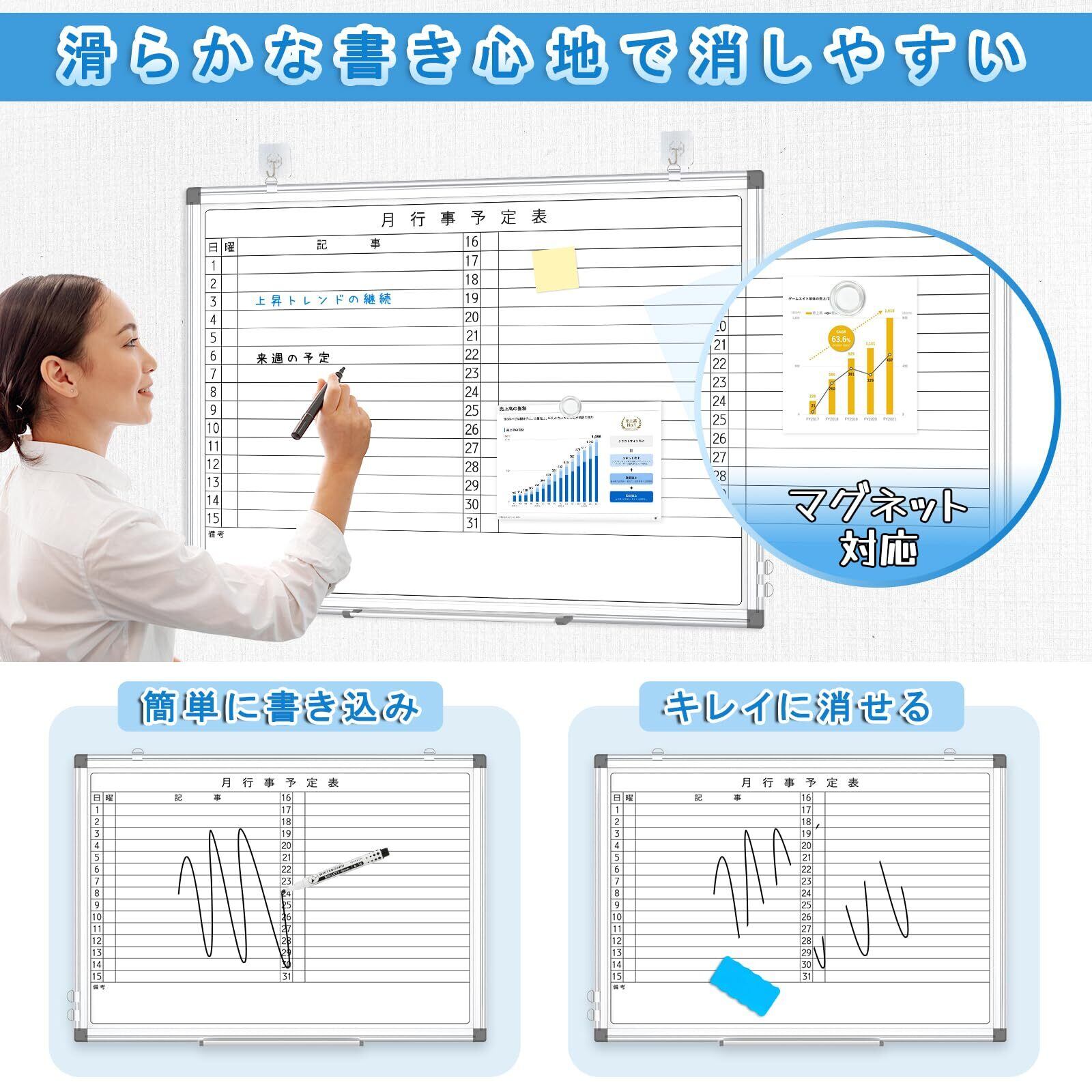 Walspax ホワイトボード 月予定表 壁掛 70x50cm マグネット ホワイトボード 罫線 月間予定表 行動予定表 ボード 両面使用 縦横兼用 アルミフレーム スケジュール帳 お支度ボード スケジュールボード ホワイトボード カレンダー おしゃれ 備考 家庭用 オフィス用品 マーカー・イレイザー付き