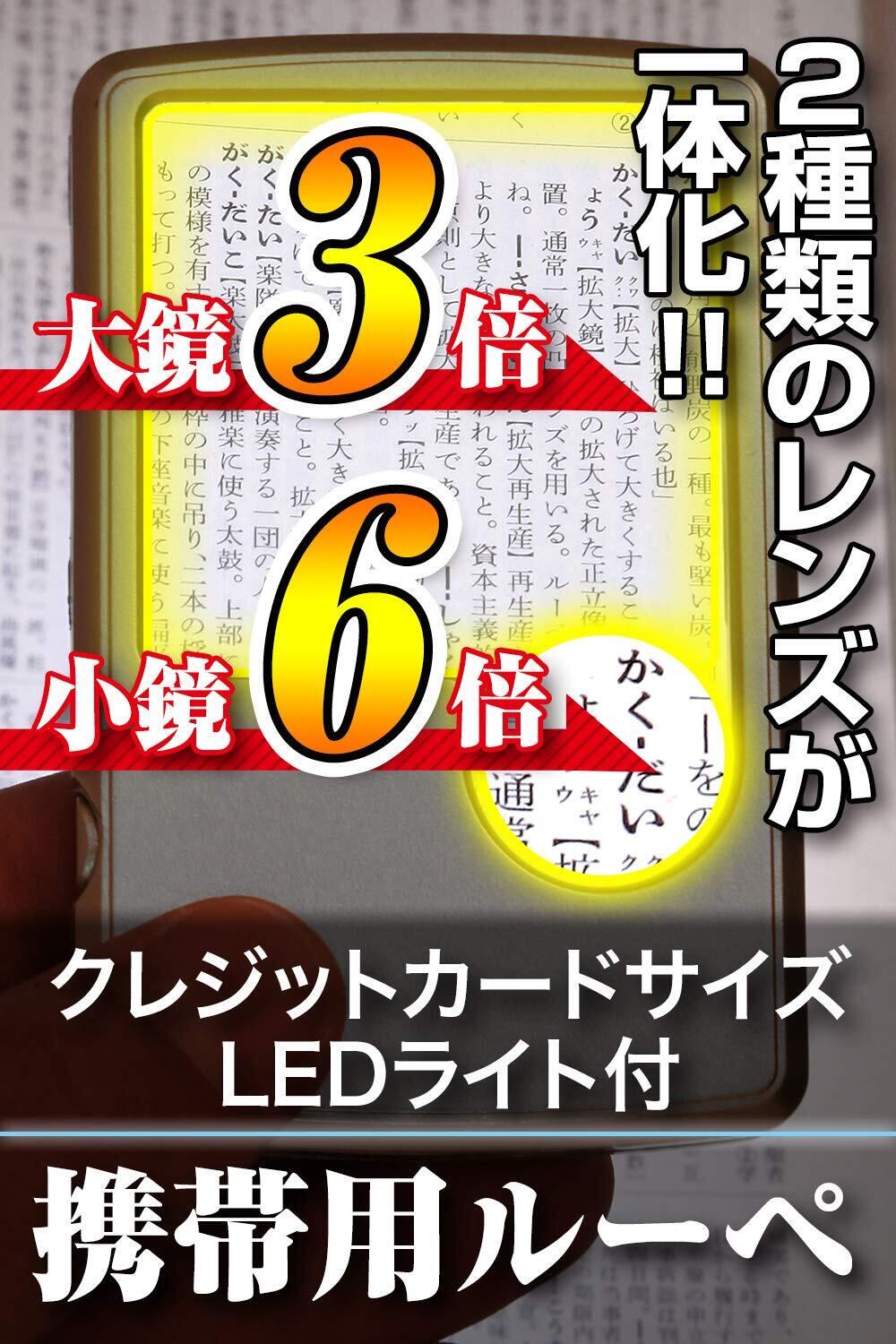 【2種類のレンズが使いやすい!】こちらには3倍と6倍の2つの倍率のレンズを搭載しています。なので、「ちょっと拡大しすぎ…」とか、逆に「もう少し拡大したい…」といった不便を感じることはありません。あなたの視力や読み物など、状況に応じて使い分けられるのはありがたいですよね。それもカードサイズのコレ1つで、とあれば、あなたにとって常に持っておきたいアイテムとなるでしょう。
