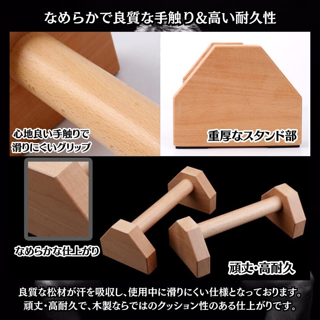 【頑丈で耐荷重に優れたプッシュアップバー】良質な松材を使用した、頑丈で安定感のあるプッシュアップバーです。耐荷重500kgと優れた強度を持つため、腕立て伏せは勿論、倒立やLシットなど、様々な運動でご利用頂くことが可能です。
