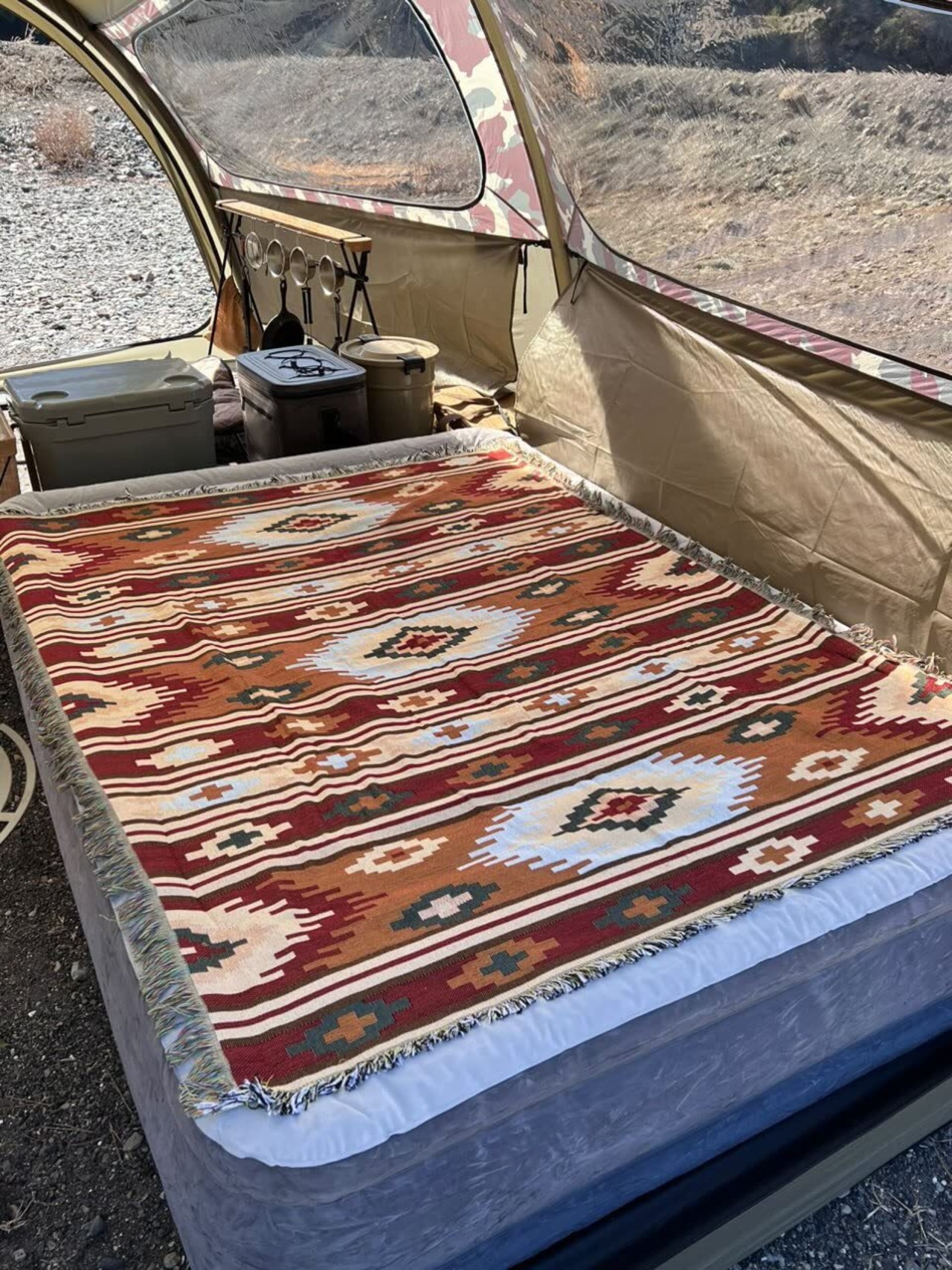 大判のメキシカンラグをコットの上に敷くだけで、まるで先住民が生活しているような空間に。ナチュラルな色あいのテントやテーブルに、メキシカンラグの派手めなデザインがマッチしています。