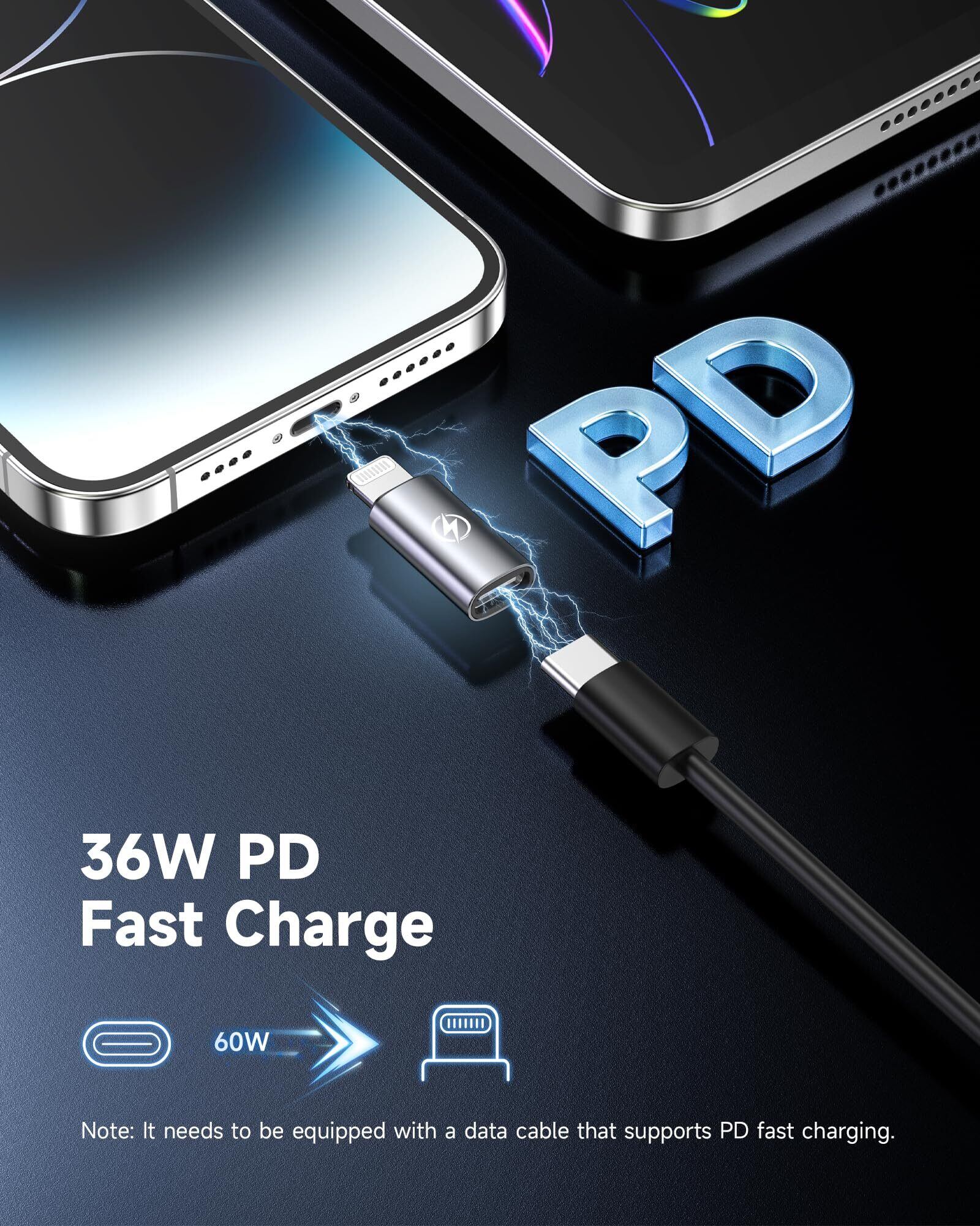 【36W急速充電】USB-C to ライトニング 変換アダプタはPD急速充電をサポートし、一部のパッドモデルでは最大36W、iPhone 8以降のモデルでは最大27Wを提供します。このアダプタを使用すると、わずか30分で電話を0%から50%まで充電できます。[USB-C電源アダプタを使用してください。USB A to Cケーブルが接続されている場合、はiPadの充電には対応しておりません。]