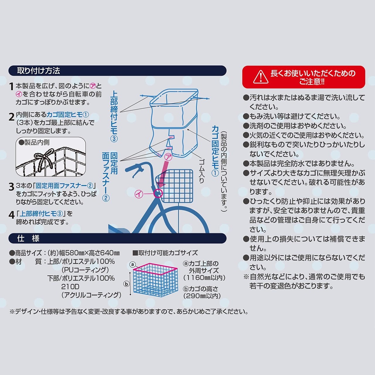 取付可能カゴサイズ:カゴ上部外周サイズ1160mm以内、カゴの高さ290mm以内