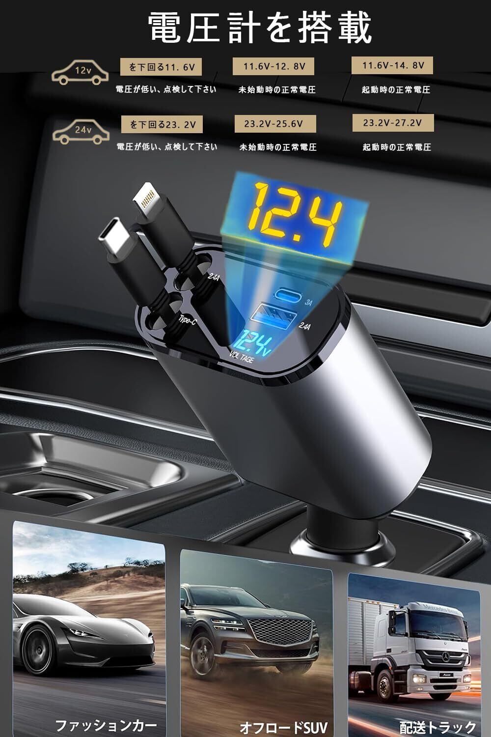 【巻き取り式】4in1 車 充電器 シガーソケット 4台同時充電 カーチャージャー 巻き取り式充電ケーブル 2本 Type-C100W/Lightning 20W急速充電 車載充電器 対応iPhone 16/15/14/13/12, Galaxy S22/S21 UItra, Xperia, iPad, AQUOSなど 電圧計を搭載 DC12/24V車対応