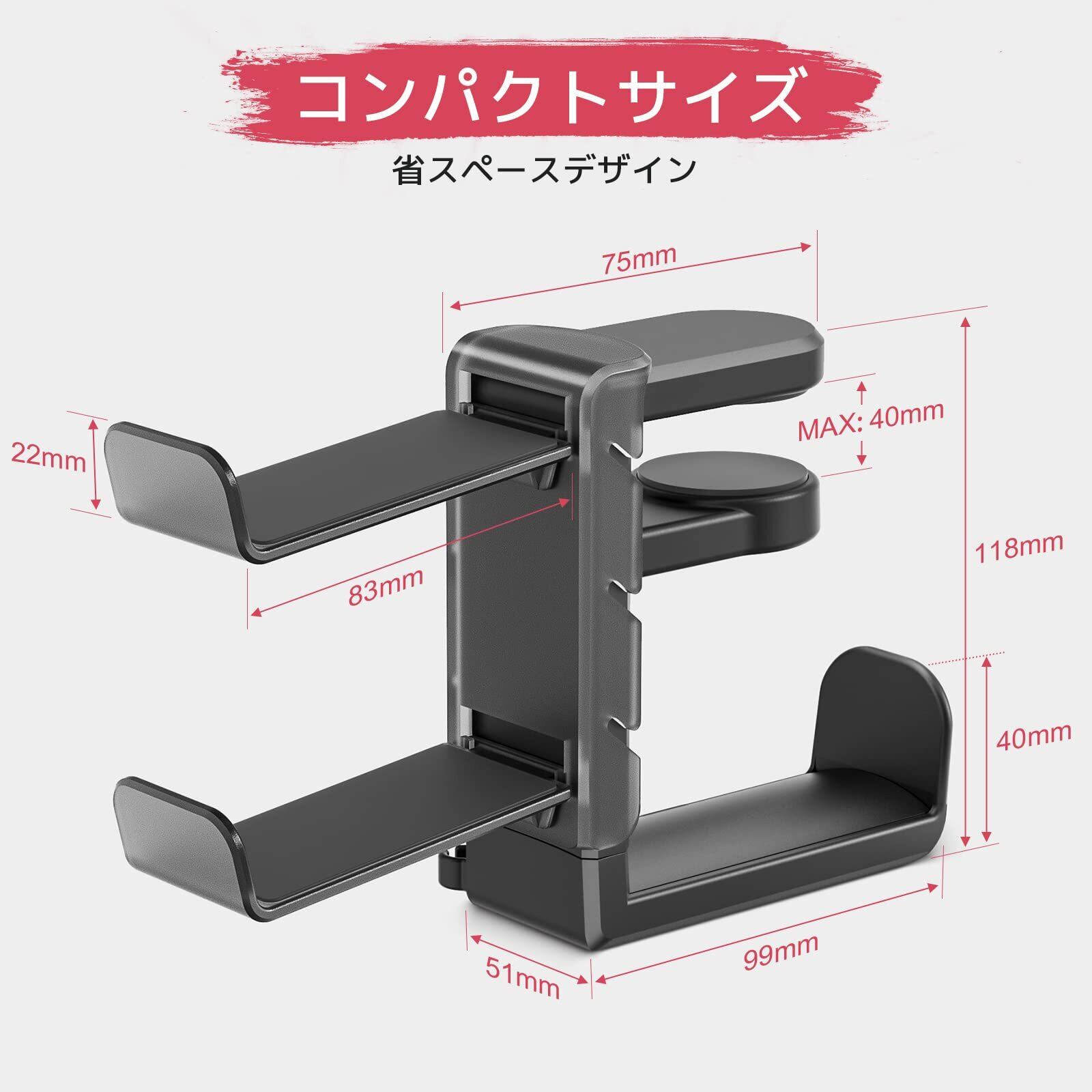 【ケーブルすっきり整理】:フックの横側にケーブルクリップがあり、絡まりやすいケーブルや有線イヤホンなどをまとめてきれいに収納でき、ゲームのときにケーブルは脚や膝に干渉せず、床まで垂れ下がる心配もありません。