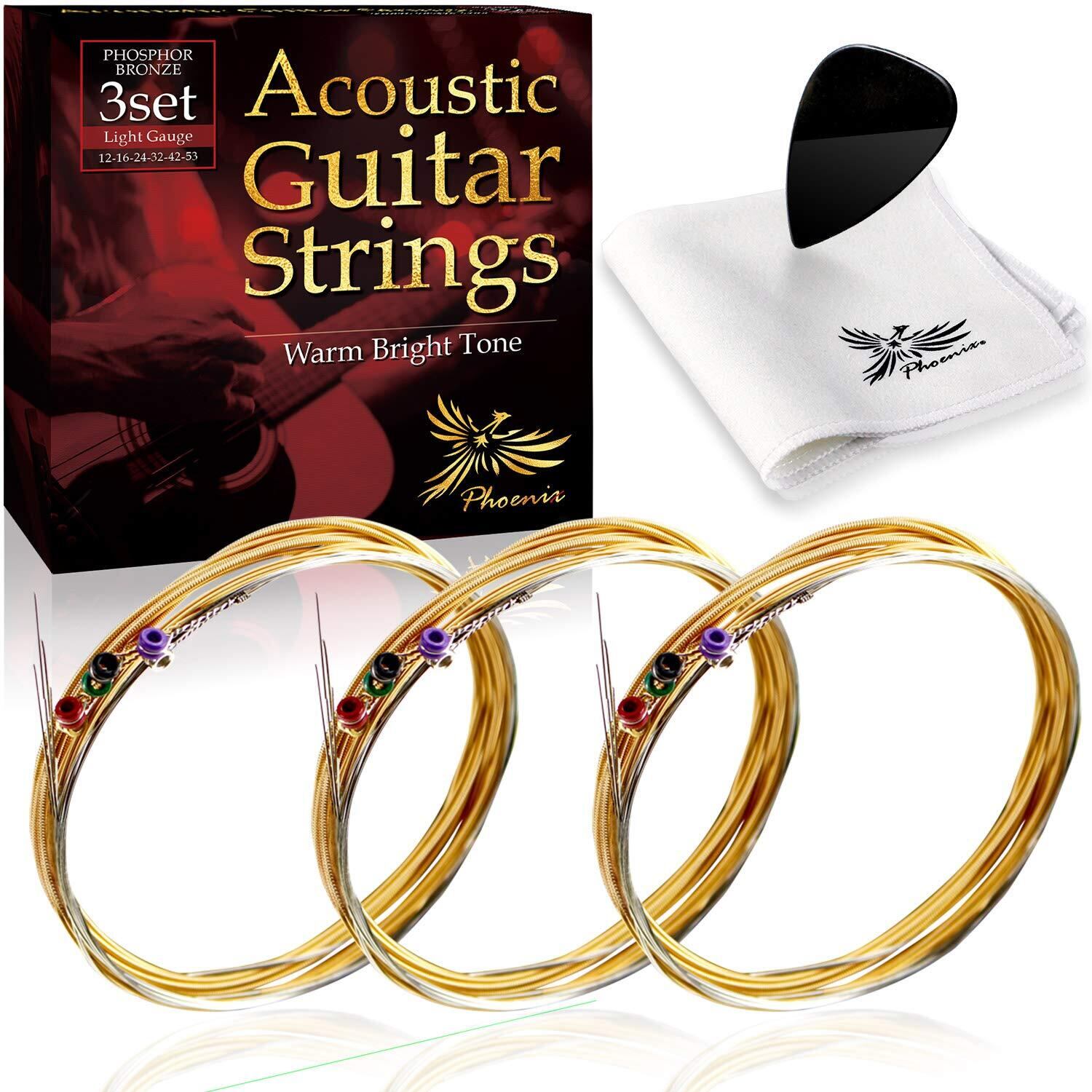 Phoenix アコースティック ギター 弦 フォスファーブロンズ PHOSPHOR_BRONZE Warm Bright Tone 3set 透明感ある音 ドンシャリ感 ポールエンド色分け/お手入れクロス&ピック 付き (ライト/Light)
