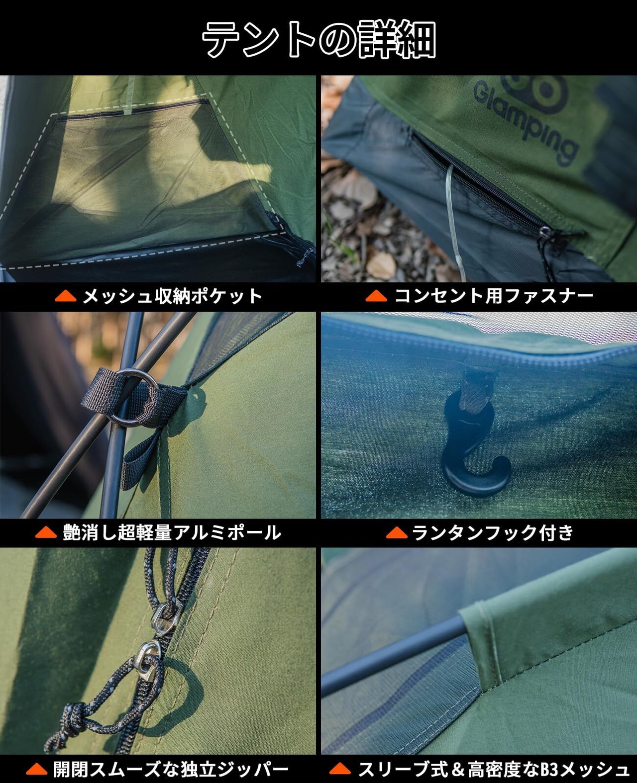 【独創的な天窓、通気性が抜群】 ソロテントは前後二つの大きい倒D字型のドアがあり、天井のスカイライトが揃って、通気性に優れています。ドアと窓は両層な構造でフルオープン、フルメッシ、フルクローズ、ハーフメッシュの切り替えが可能で自分の好みや気候条件に合わせて通気性とプライバシーを調整することができます。 天窓により、テント内に星を見ながら眠ることもできます。通気性の高さと天窓からの換気により、内部の空気が循環しやすくなって、結露も起こりづらいので非常に快適な空間となっています。