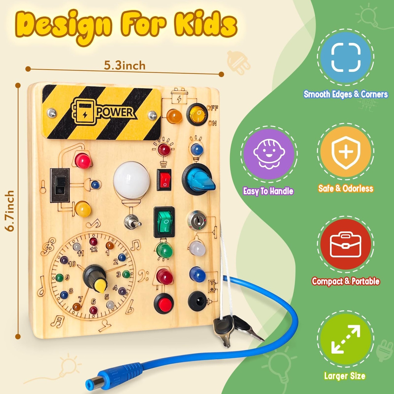精巧なデザイン - この忙しいボードは、スイッチやLEDライトで遊ぶのが好きな小さなお子様のために特別に作られています。 このビジーボードには10個の個別のスイッチがあり、各スイッチは異なる色やスタイルのLEDライトに関連しています。 各LEDの明るさは乳児にちょうどいいように設定されています。明るすぎたり、目がくらんだり、暗すぎたりせず、よく見えません。マスタースイッチは、電力を無駄にしないように、ワンクリックですべてのLEDライトをオフにするように設定されています。