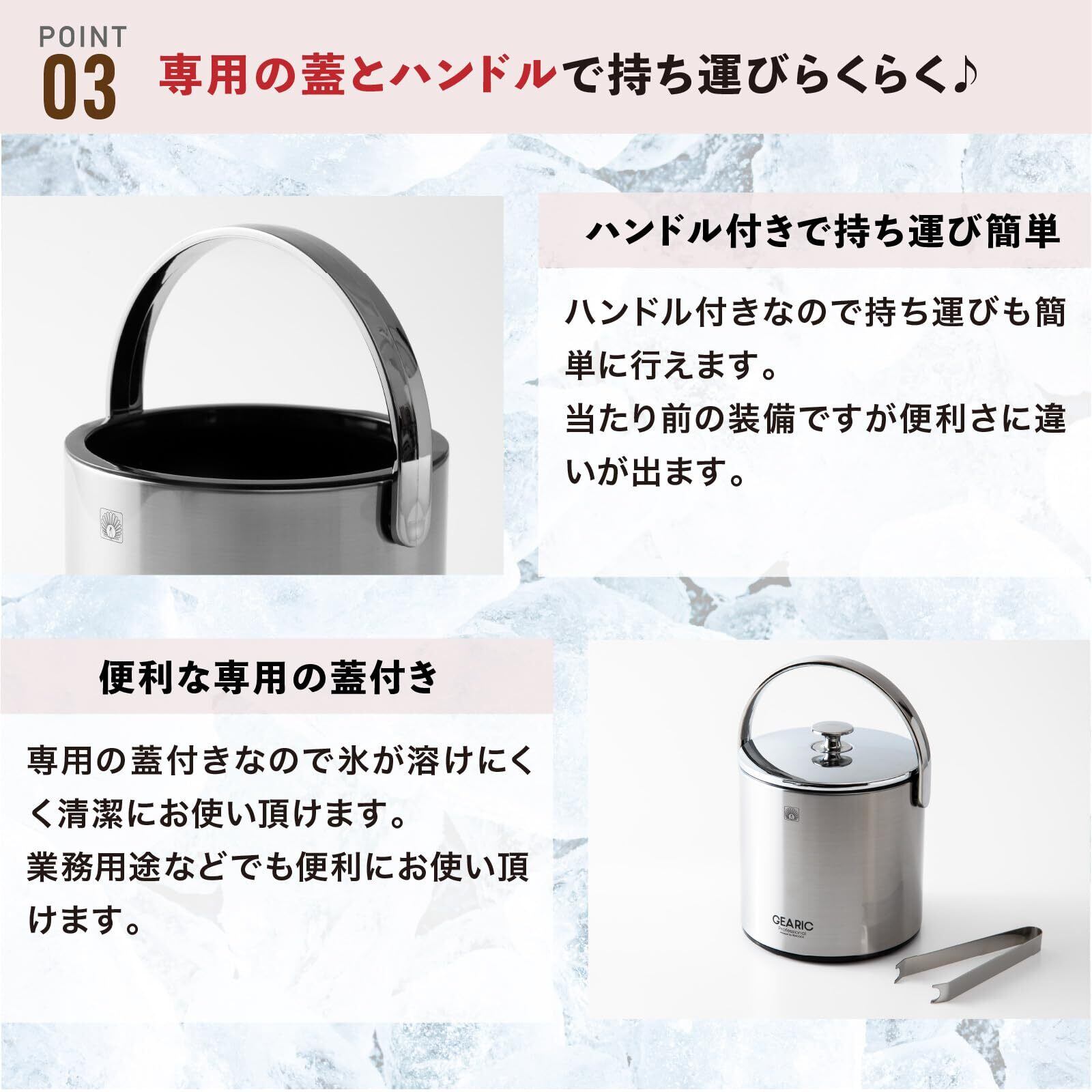 素材・材質:ふた/鋼 (クロームメッキ仕上)、内容器/ポリエチレン、銅/ステンレス鋼、アイストング/ステンレス鋼