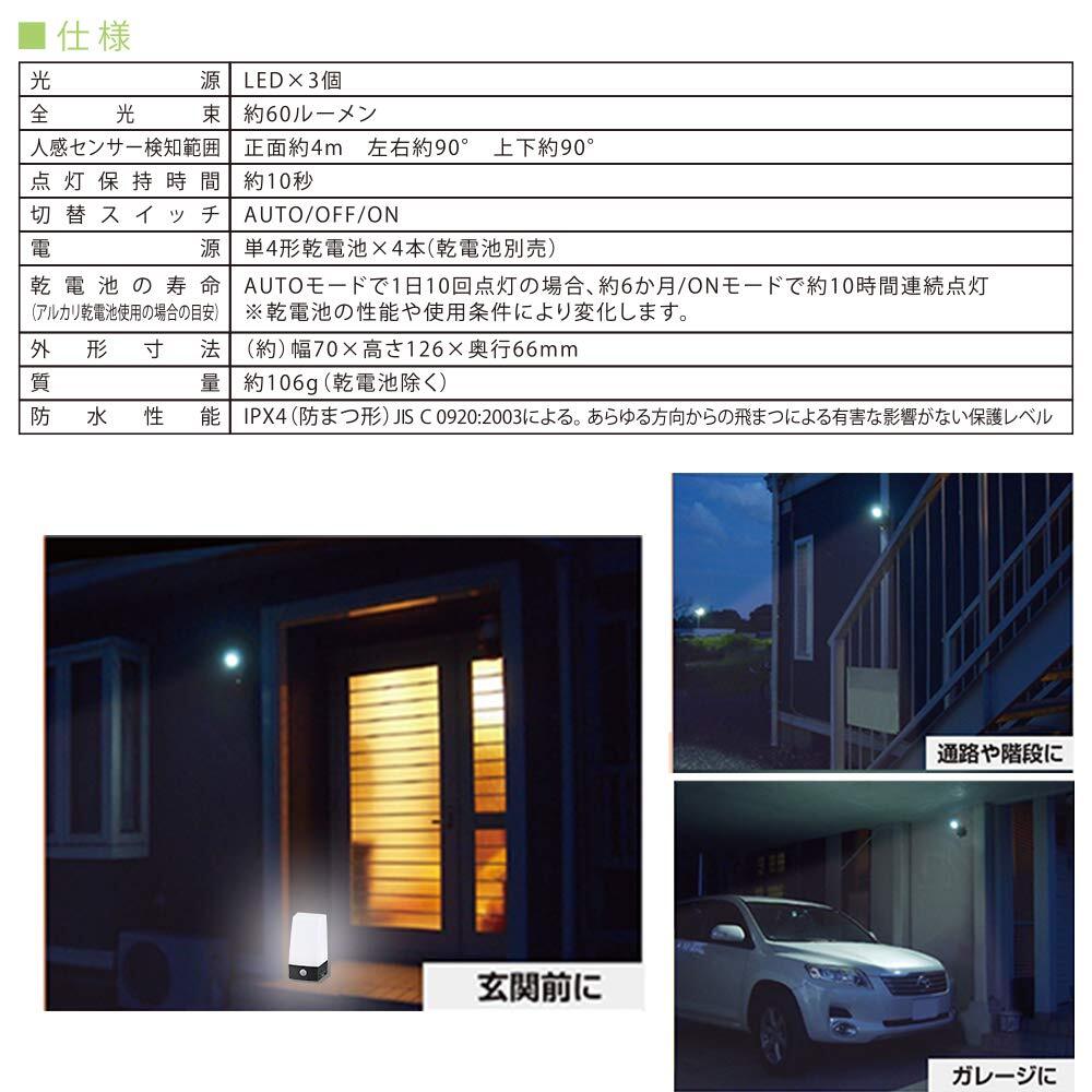 光源:LED×3個、全光束:約60ルーメン、人感センサー検知範囲:正面約4m、左右約90度、上下約90度