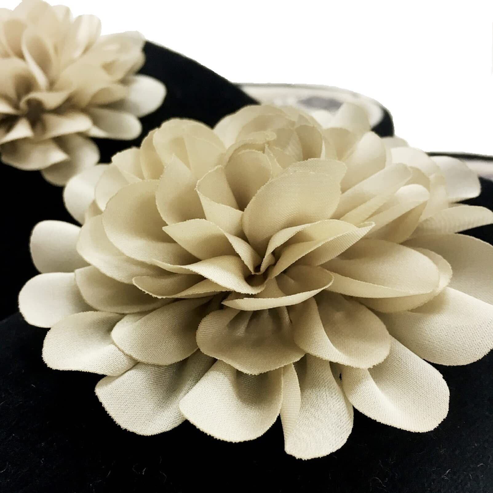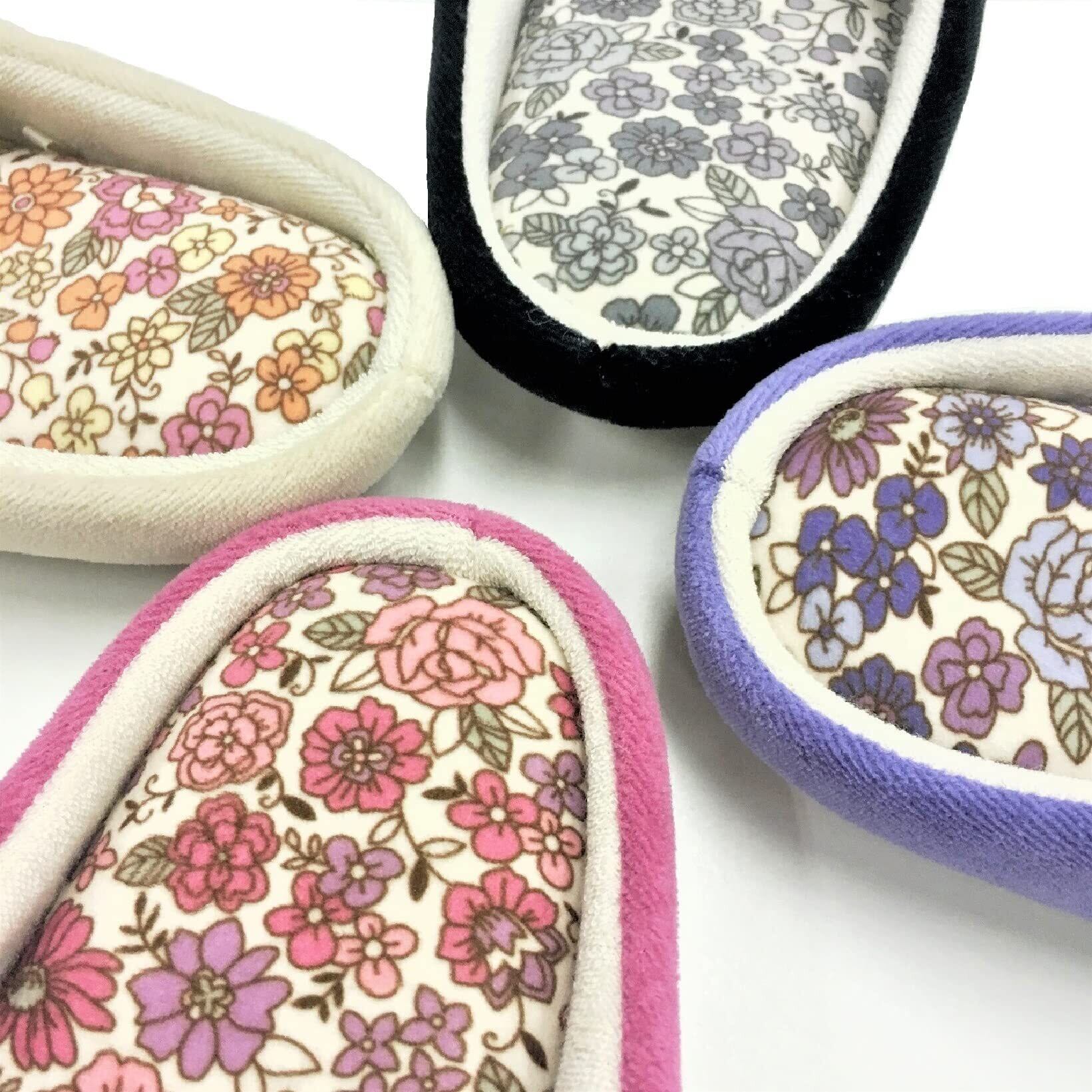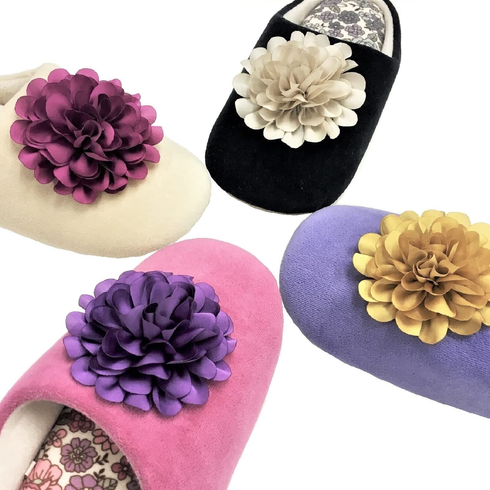 サテン生地の花モチーフを付けたインテリアスリッパ。中板には小花柄がプリントされた生地を使用、表生地にはふんわりと柔らかな綿ベロアのカラー生地を使っており、個性あふれるデザインになっています。ウォッシャブル(タンブラー乾燥不可)。