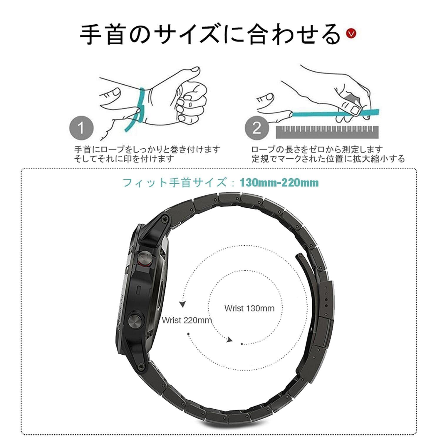 手首サイズに適合: テストにはFenix 5X(直径51mm)を使用しています。リストバンドは、155mmから220mmの手首サイズに適しています。付属の調整工具で、留め金を加えたり外したりすることができで、自分の手首周り寸法によってバンドの長さを調整することが可能です.
