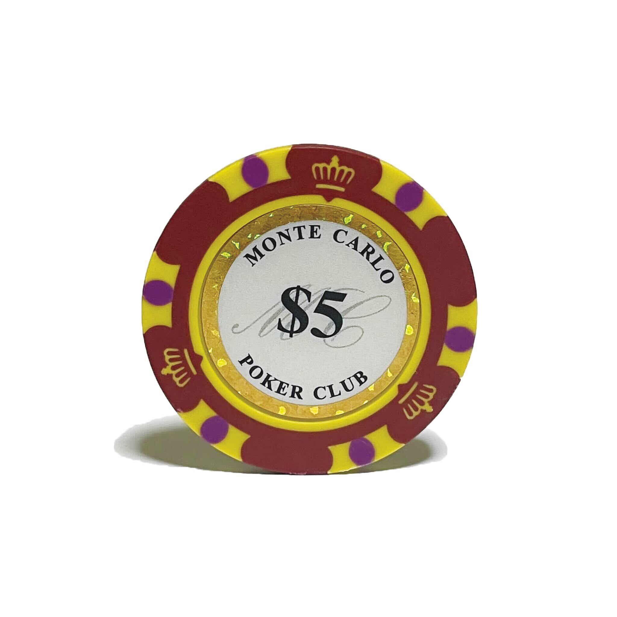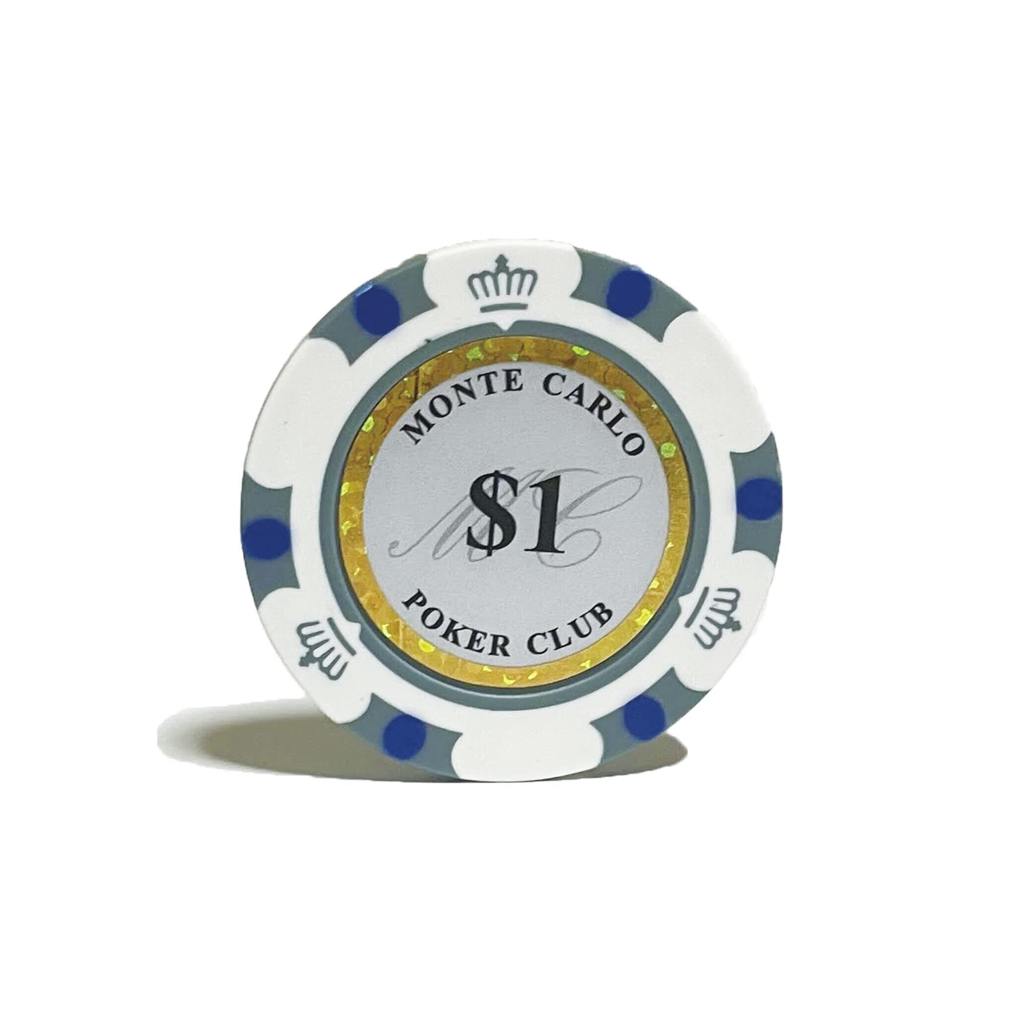 チップサイズは約:直径40mm×厚さ3.4mm、重さ14g (各20枚 1$、5$、25$、50$、100$)