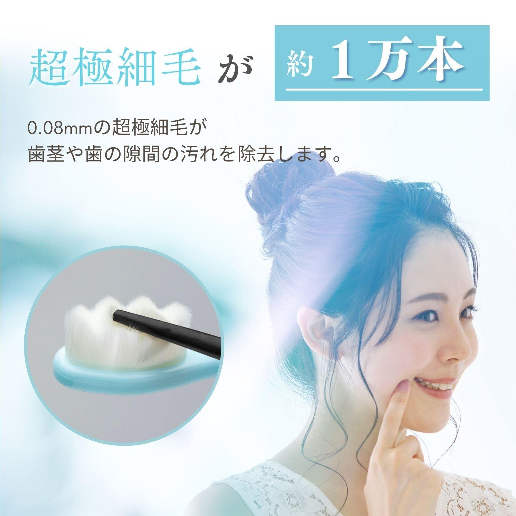 【歯ブラシの特徴】1. 『超極細毛1万本の歯ブラシ』:0.08mmの超極細毛が歯茎や歯の隙間の汚れを除去します。2. 『高密度で柔らかい毛が歯茎を優しく磨く』:高密度で柔らかい毛が歯と歯茎を優しく包み込み、歯の摩耗やダメージを軽減します。3. 『個包装の6本セット』:個包装で衛生的かつ使いやすい歯ブラシとなっています。