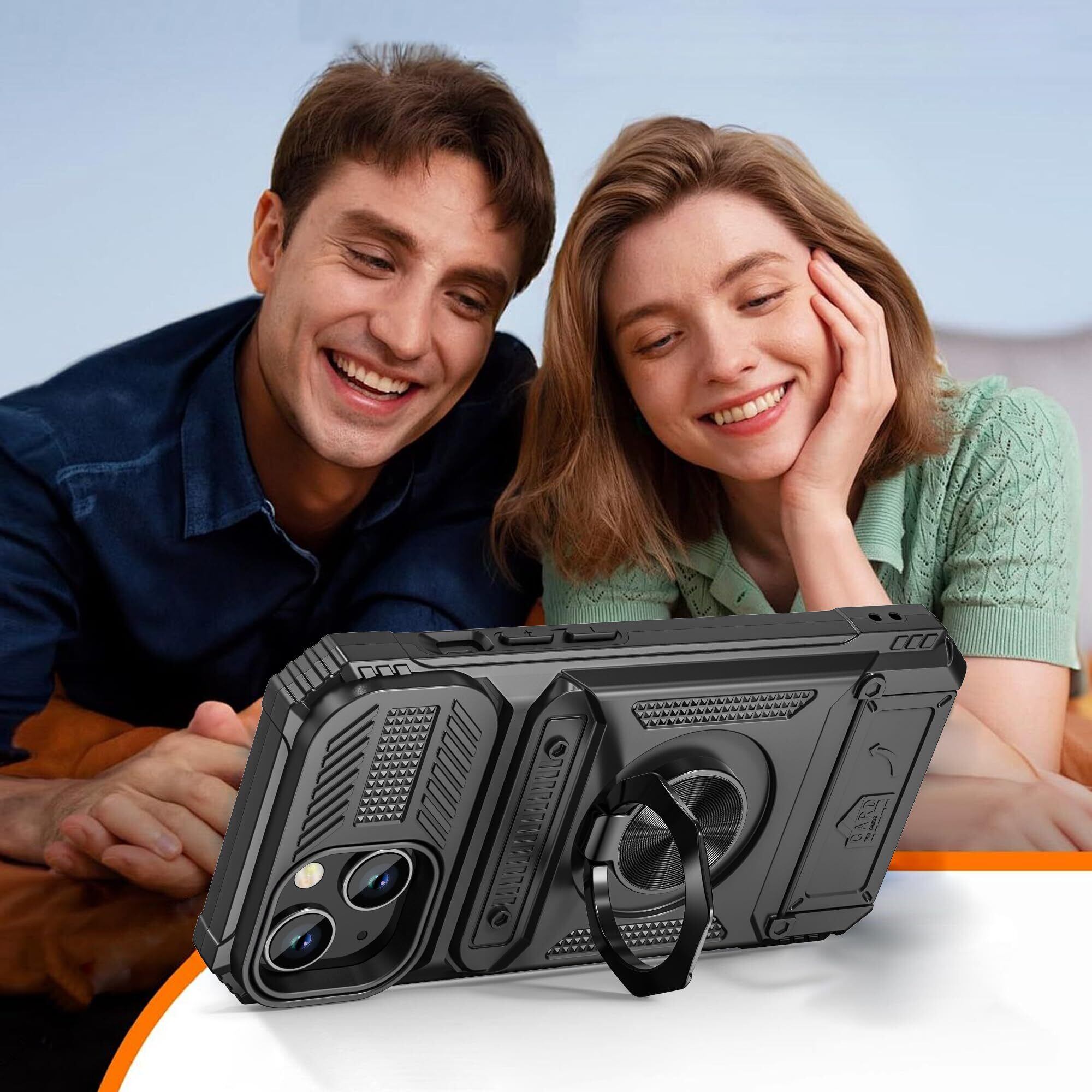 VOFOLEN for iPhone15 ケース カード入れ (2枚) アイフォン15 ケース カード収納 背面 手帳型ケース 360°回転 リング付き 車載ホルダー対応 スマホケース 米軍MIL規格 耐衝撃 いphone15 ケース マット質 メンズ携帯ケース 落下防止 iPhone 15 カバー ブラック