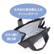 【便利な仕様】ファスナー付きの開口部が大きく開くので、お弁当の出し入れがスムーズにできます。大きめのメッシュポケットには保冷材だけでなく、お手拭きや調味料など細々したものも入れられて便利な仕様です。