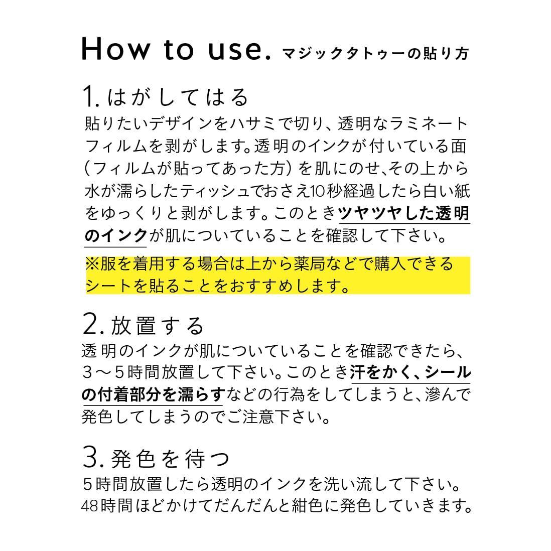 「MAG!C TATTOOとは?」 約2週間肌を染めるタトゥーシールです。 従来のタトゥーシールとは異なり肌の角質を染めるため、汗や水に強く剥がれる心配がありません。