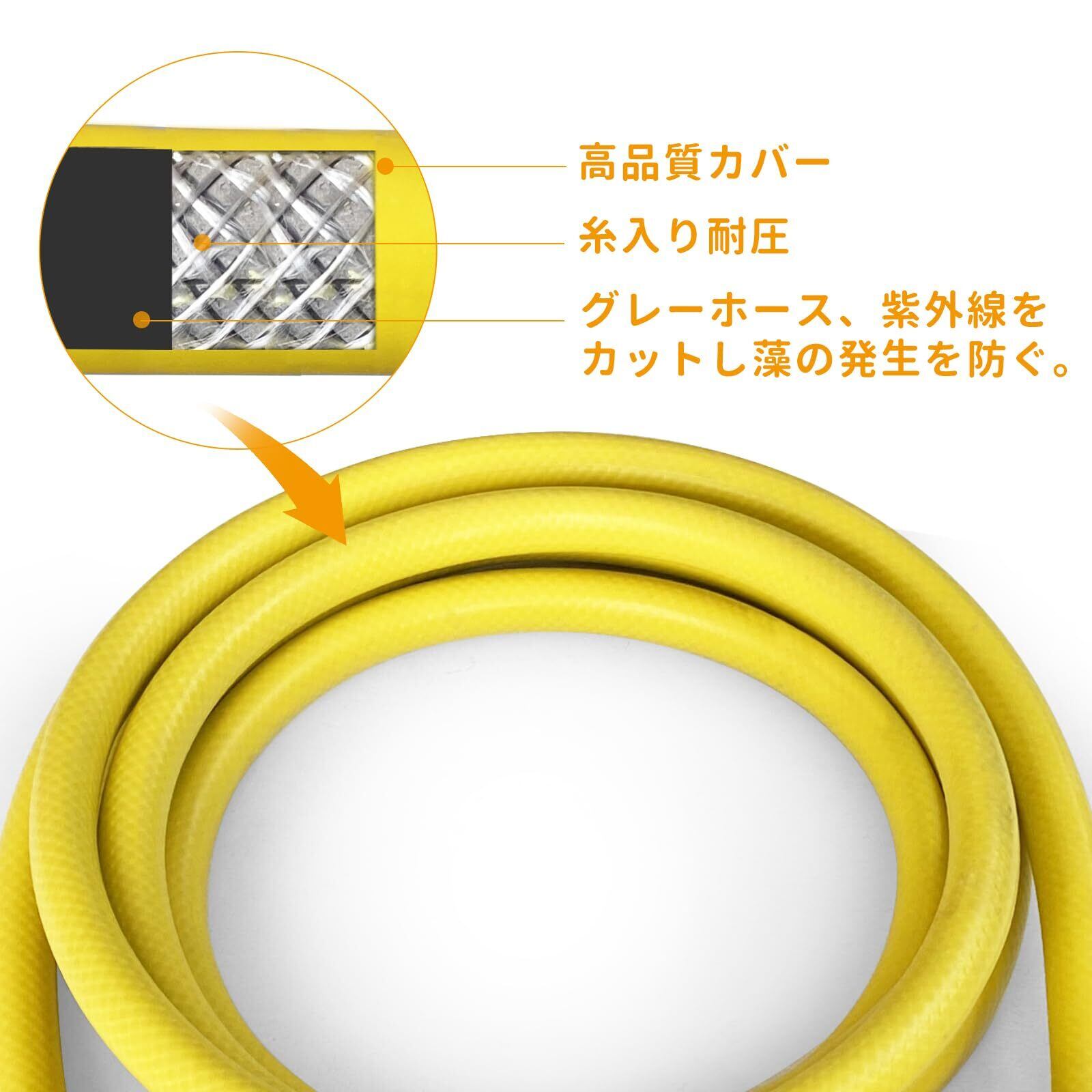 【高耐久】ホースの外層は摩擦抵抗軽減処理が施されています。中層はポリエステル糸が編み込まれているため、耐圧性に優れています。内層はグレーホースを採用しているため、紫外線をカットし藻の発生を防げます。