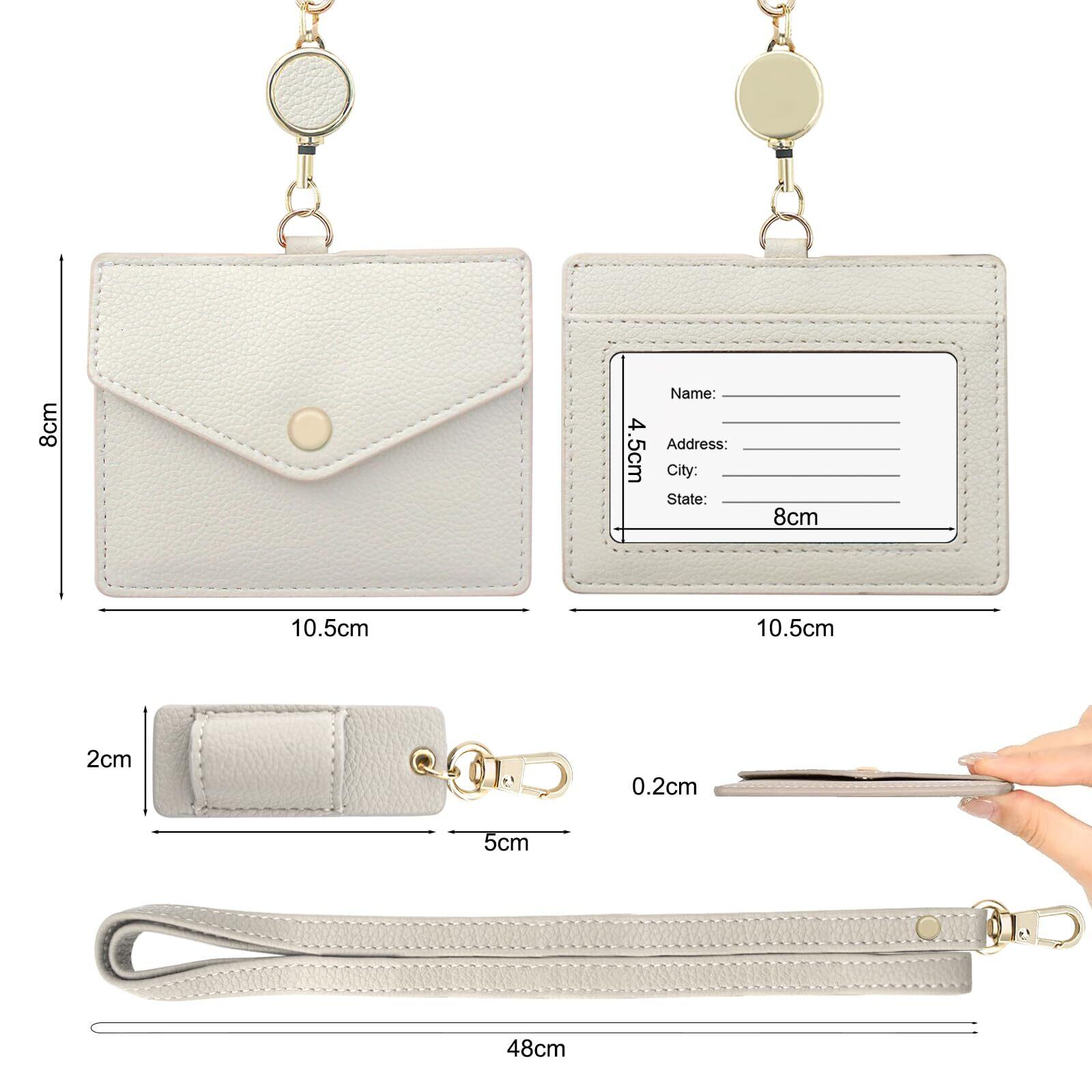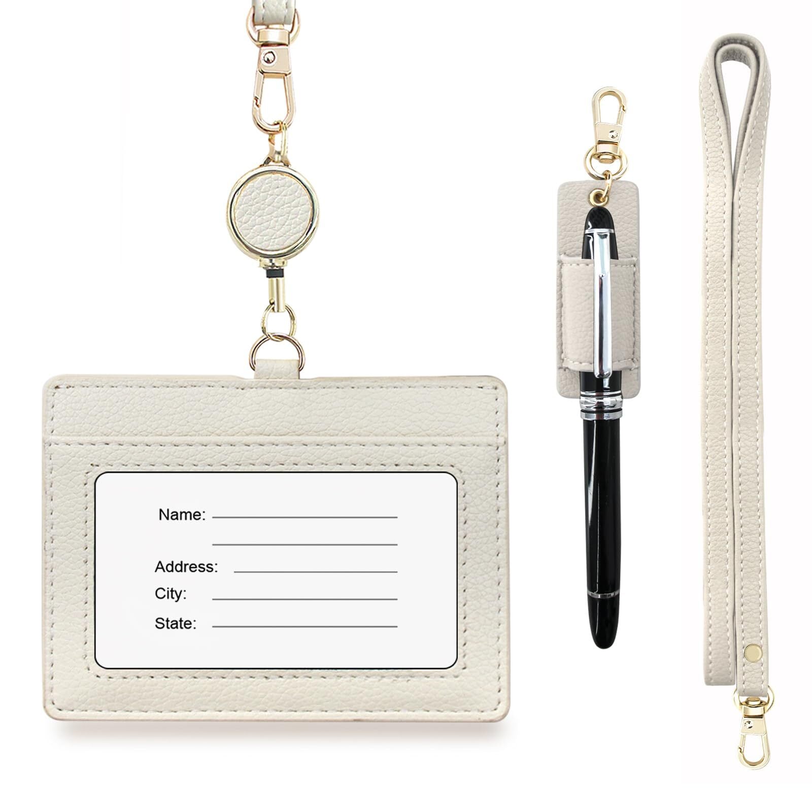 Boshiho パスケース 名札 横型 リール付き ネックストラップ付き 首掛け 定期入れ おしゃれ ネームホルダー 社員証ケース 2枚 両面 革 名刺入れ カードケース レディース メンズ ペンホルダー付き IDカードホルダー 通勤 通学 ホワイト