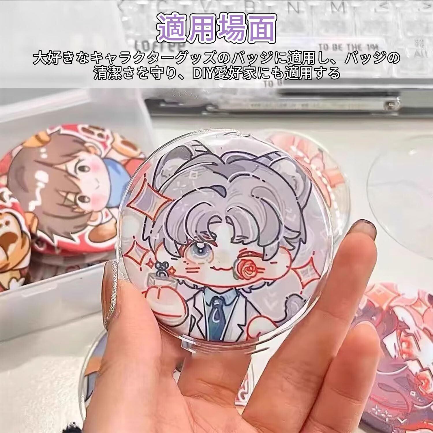 【多様な用途】缶バッジカバーは、アニメグッズのバッジの保護や収納に最適です。バッジの完全さと清潔さを保ちながら、お気に入りのアニメグッズを長く楽しむことができます。また、キーホルダーや他の小物の収納にも使用できます。