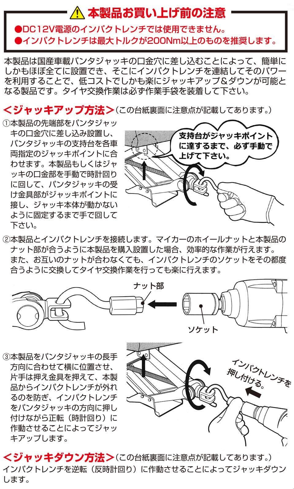 車載ジャッキ(パンタグラフジャッキ)の口金穴に取付ければ、お手持ちのインパクトレンチでジャッキアップ&ダウンが可能に!