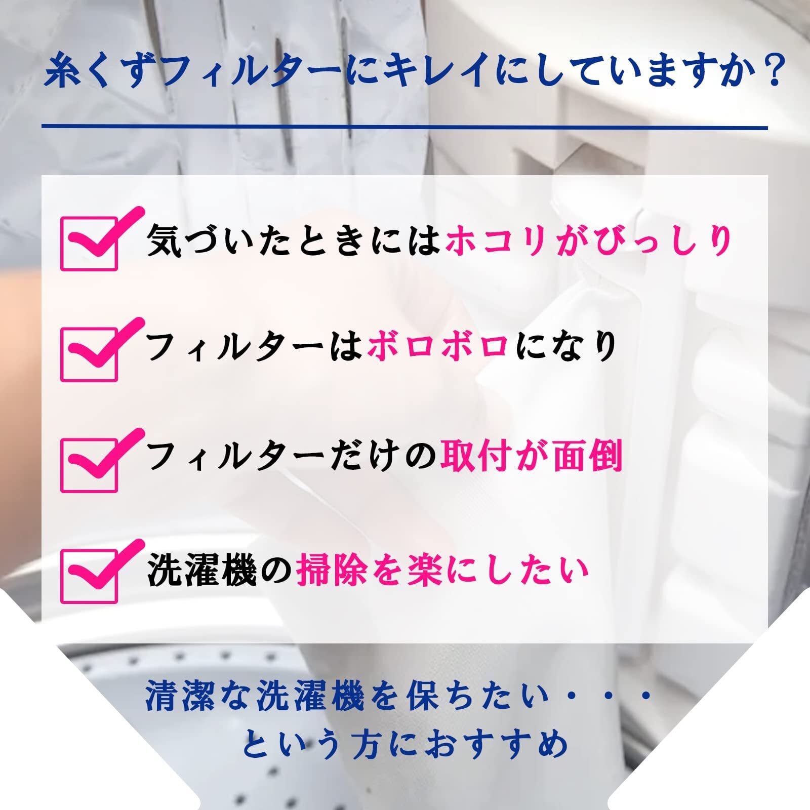 『特徴』 ① 【高品質素材】耐久性のあるマイクロファイバー素材で作られており、長期間の使用にも耐えられます。 ② 【効果的なフィルタリング】 糸くずや髪の毛、ペットの毛などを効果的にキャッチし、洗濯物を清潔に保ちます。 ③ 【洗濯機寿命延長】 フィルターが糸くずやゴミをキャッチすることで、洗濯機のドラムや排水口への負担を軽減し、寿命を延ばします。 ④ 【環境に優しい】繰り返し使用できるため、使い捨てフィルターよりも環境に優しい選択です。