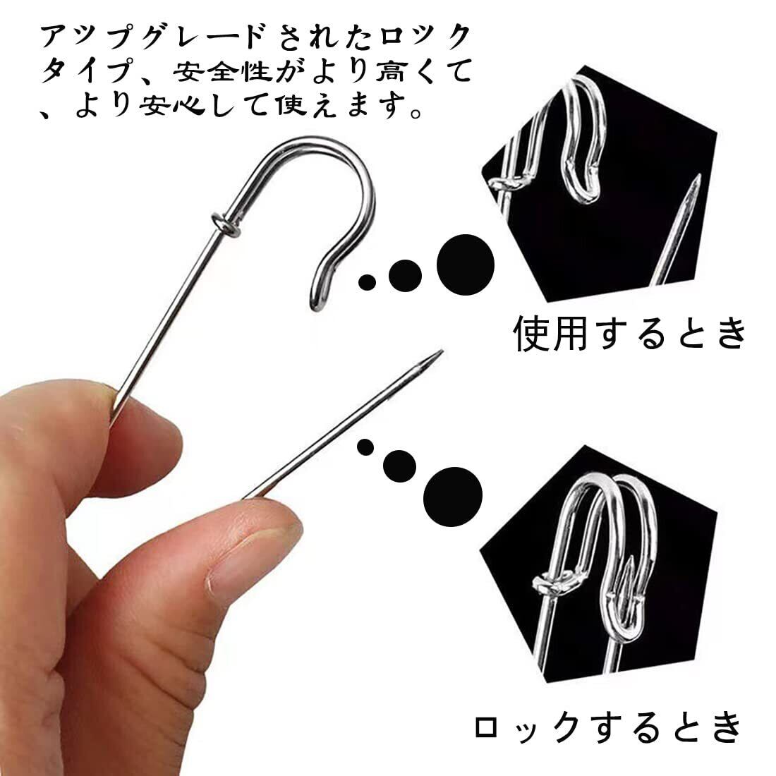 【高品質&安全デザイン】丈夫で、大きいサイズのおしゃれの安全ピンです。合金鋼を採用しており、硬度が高くて、長くご使用いただけます。さらに、ロックタイプの安全ピンなので、曲がった溝が針先を覆っていて、より安心して使えます。