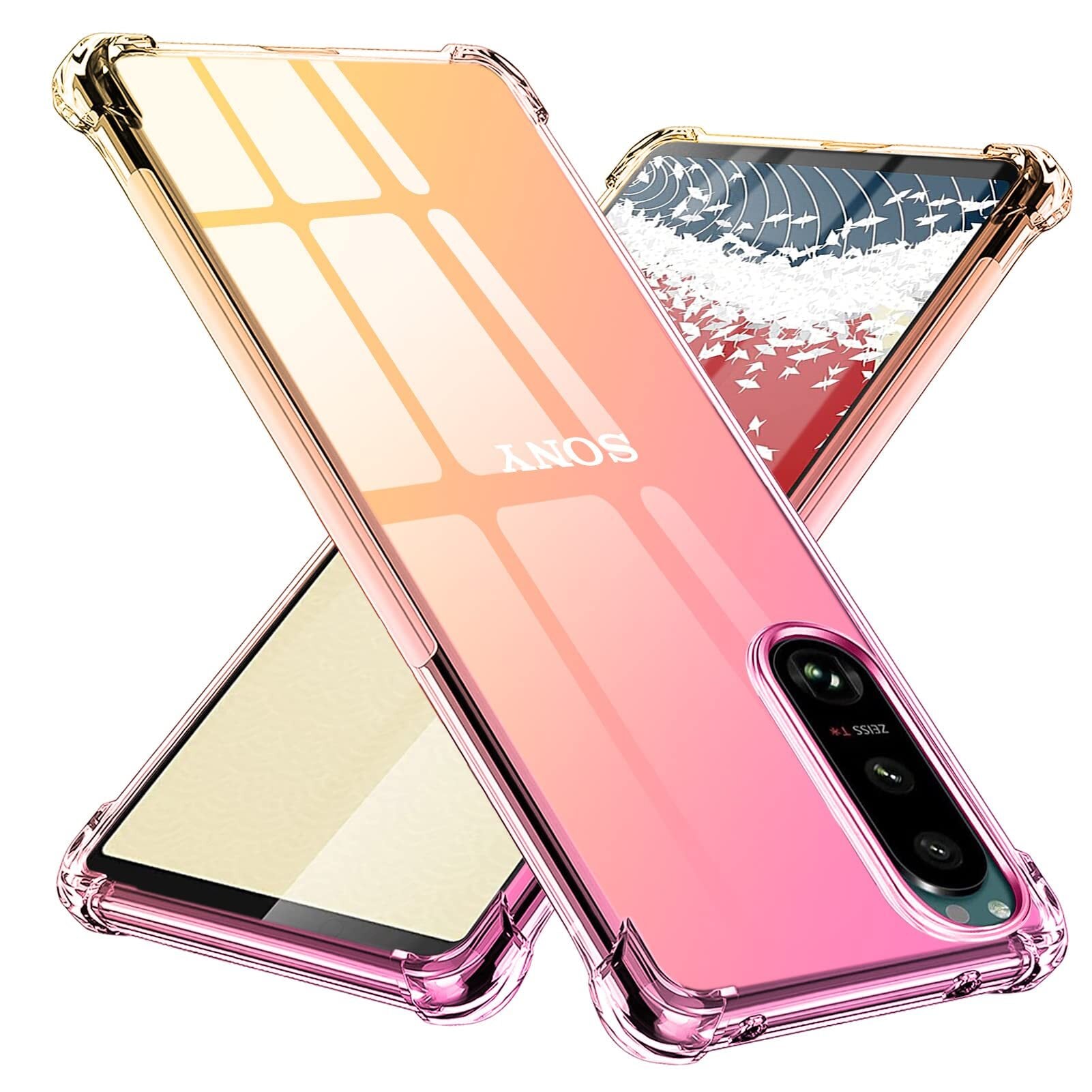 TMUJWS Xperia 5III ケース シリコン クリア グラデーション ソフトケース 薄型 軽量 SOG05 SO-53B ケース 耐衝撃 レンズ保護 エクスペリア 5 iii ケース 全面保護 tpu 四隅空気衝突防止 擦り傷防止 ストラップホール付き 人気 携帯カバー ピンク+金 MZ75-40