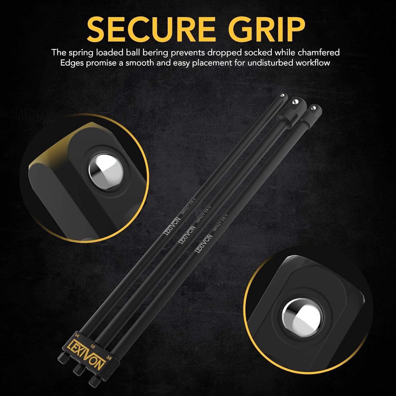 1/4、3/8、1/2インチのスクエアドライブ - 落下防止のためのリテンションボール付きで、面取りされたエッジがソケットにしっかりとフィットします。