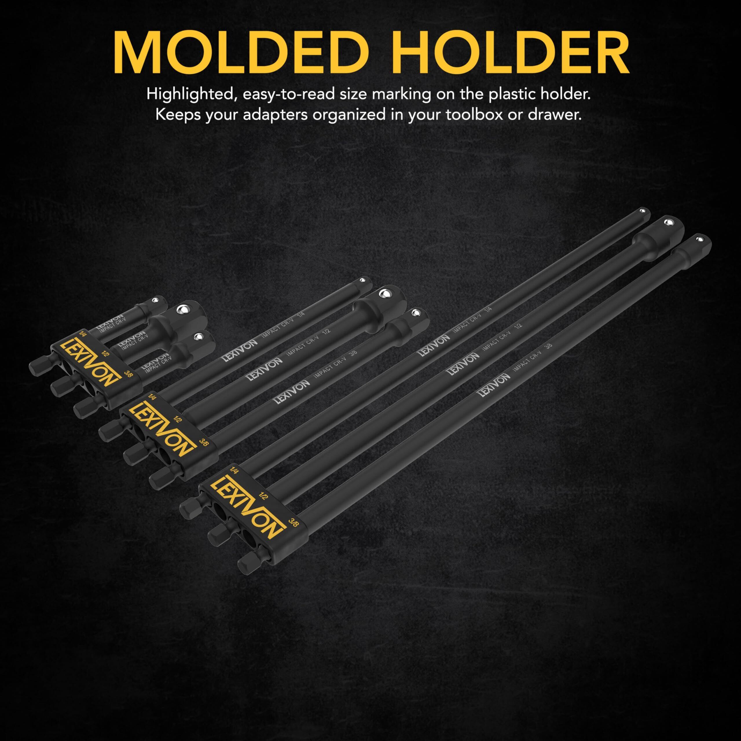 LEXIVON インパクトグレードソケットアダプターセット (9個入り)、76.2mm(3インチ)、152.4mm(6インチ)、304.8mm(12インチ) ホルダー付延長ビット | 6.35mm (1/4インチ)、9.5mm (3/8インチ)、12.7mm (1/2インチ) ドライブ、電動ドリルを高トルクインパクトレンチに対応 (LX-105)