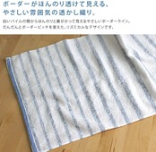 【薄手でもしっかり吸水】毎日使いやすくするため、やや薄手に織り上げています。それでも吸水性は今治タオルの厳しい検査基準をクリア。しっかり吸水してくれます。白いパイルの間からほんのりと霧がかって見えるやさしいボーダーラインが軽やかで、心地よくお使いいただけます。