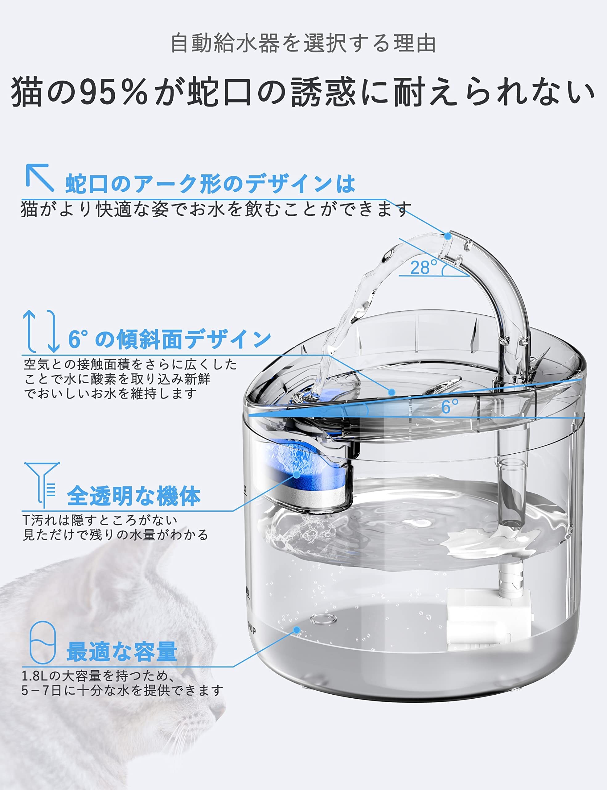 【ちょうどいい容量水タンク】 ペット給水器1.8L大容量を持つため、頻繁的に水を補充する必要がない。中小型犬や猫1匹で、一週間ほどに自動給水対応!猫 みずのみ 自動給水器の貯水カバーに約120mlの貯水ボウル、一時的の停電も大丈夫!全透明なデザインと水位線で、貯水タンクの水量や水質も即時監視できます。ネコちゃん、ワンちゃんだけではなく、ウサギ、小鳥など他のペットにも使えます。短期出張や残業、旅行などの場合に最適です。