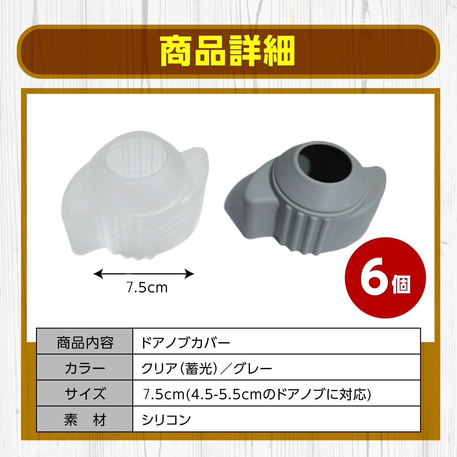 ※取扱説明書は付属しておりません。【商品内容】ドアノブカバー【セット内容】6個【カラー】クリア(蓄光)/グレー 【サイズ】7.5cm(4.5-5.5cmのドアノブに対応)【素材】シリコン ※モニターの環境により、色の見え方に若干差が生じる場合がございます。