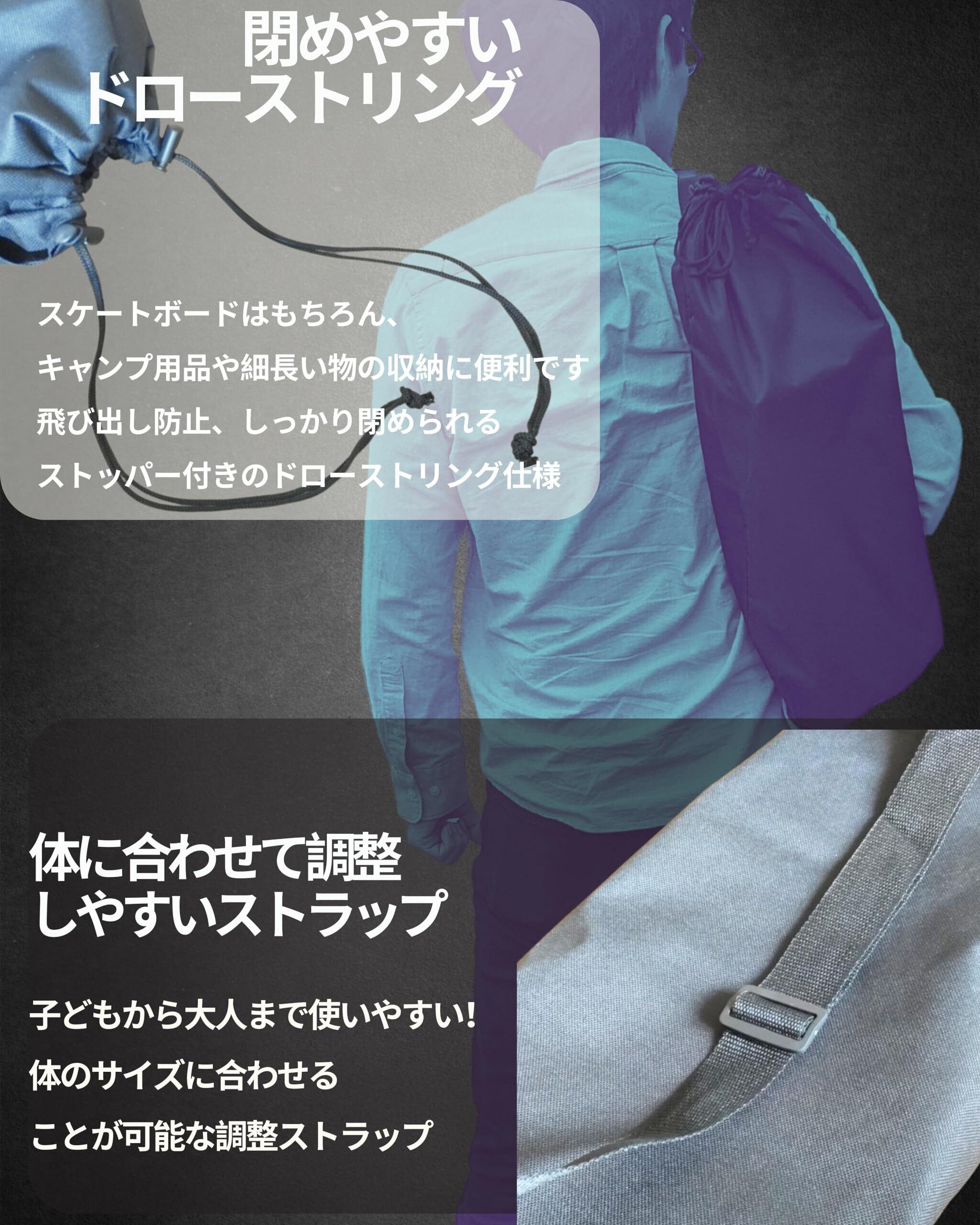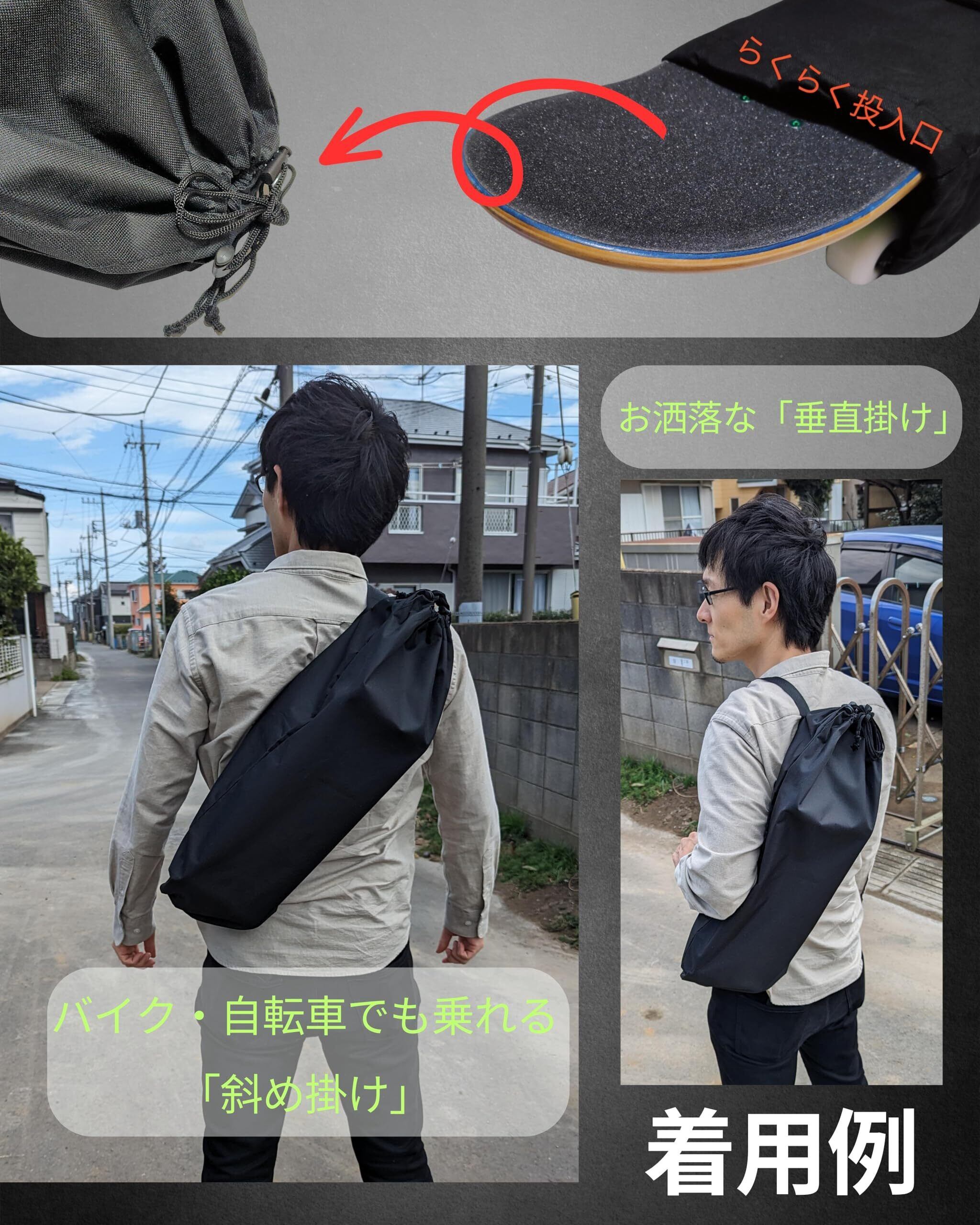 スケートボードがきれいに入るショルダーバッグです、チャリ乗る時に使いやすいのでセッション先までの移動におすすめ!