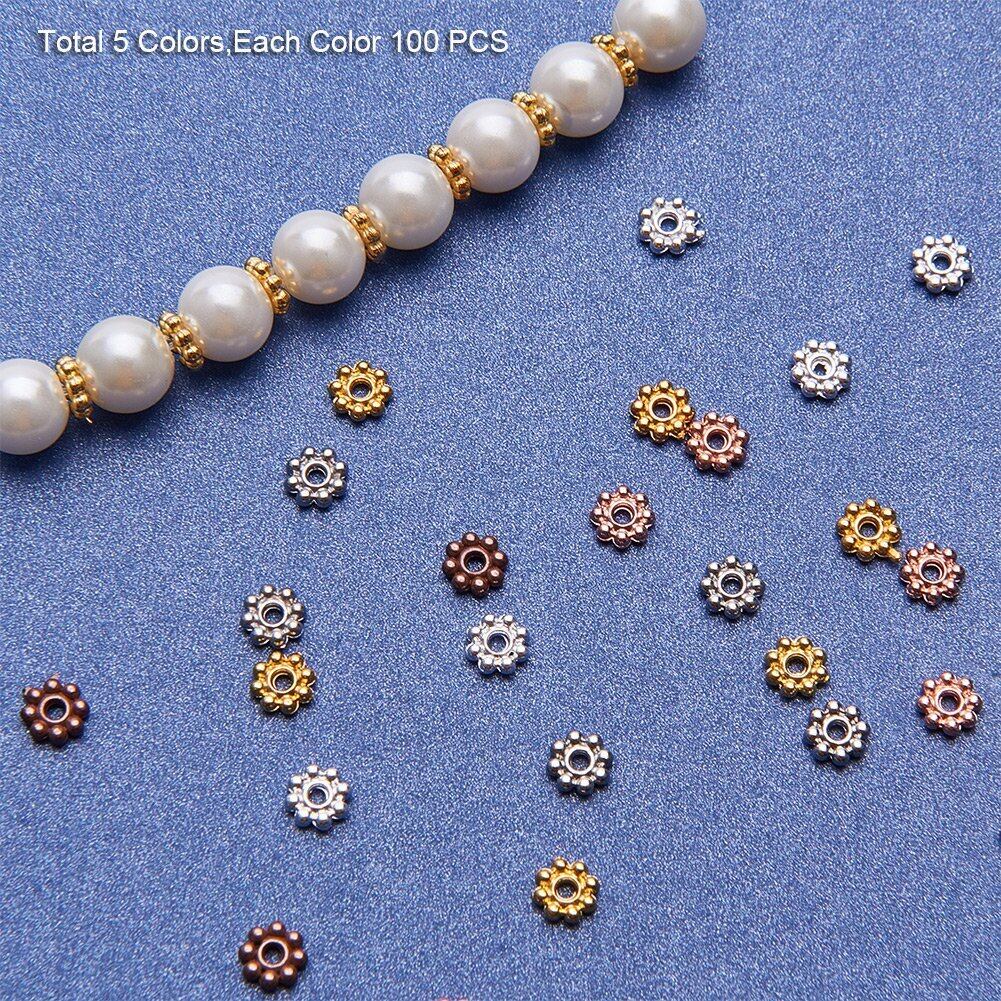 PH PandaHall 約500個/箱 5色 合金 スペーサービーズ 5x1.5mm 菊座 花座 座金 チベットスタイル ビーズ メタルビーズ チャーム ジュエリー製作 アクセサリーパーツ DIY用 クラフト 手作り素材 混合色