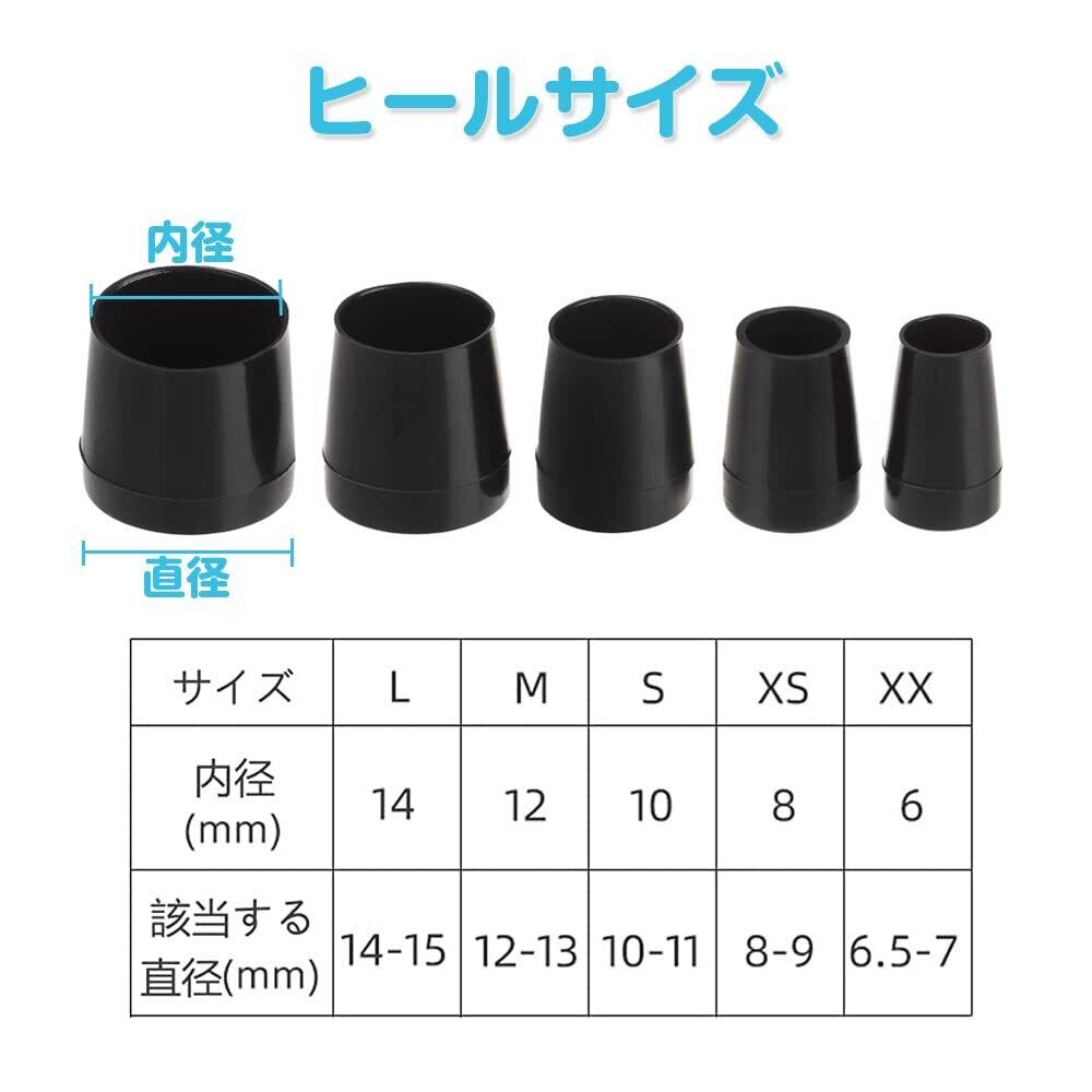 【適用ヒールサイズ】5サイズ。XXサイズ:ヒール直径6.5mmと7mm。XSサイズ用:直径8mmと9mmヒール。Sサイズ用:ヒール直径10mmと11mm。Mサイズ用:ヒール直径12mmと13mm。Lサイズ用:直径14mmと15mmヒール。